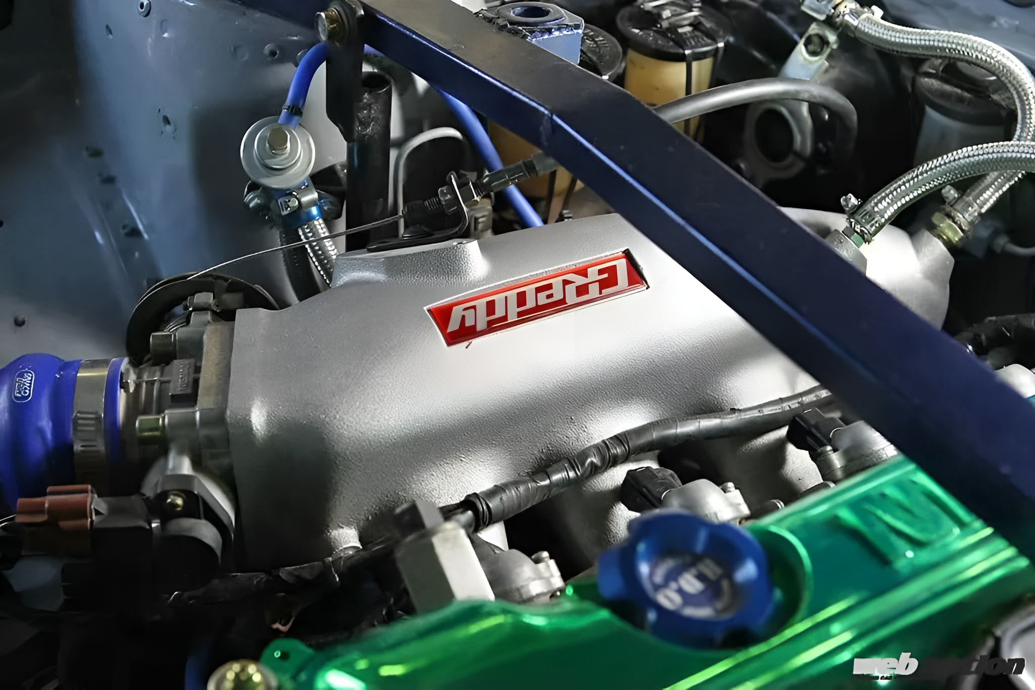 そこで心臓部には、チューニング適応度が高く軽量なSR20DETを換装。東名パワードの2.2Lコンプリート“ジェネシス”をベースに、社外カムなどを組み込んで徹底的に鍛え上げている。