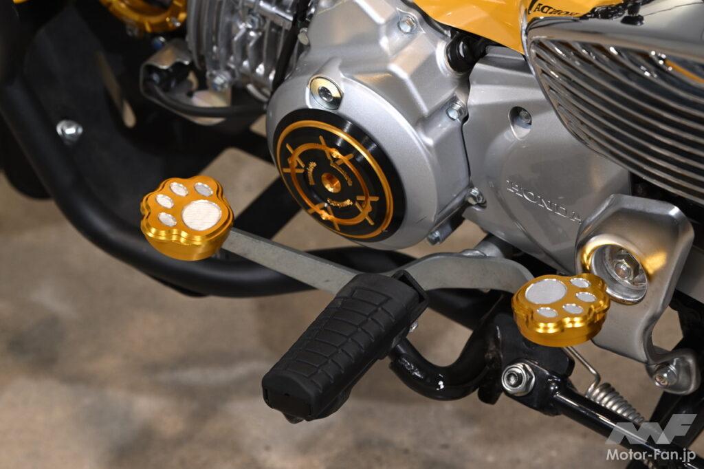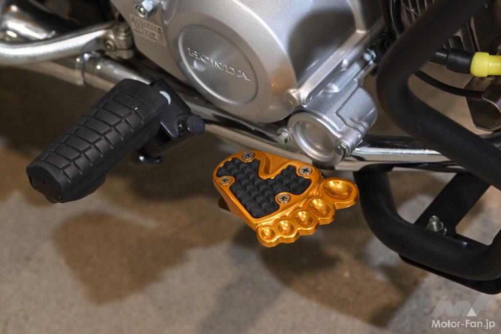 靴の当たる面積が広くなることで操作性が向上するブレーキペダルカバー(3850円)は写真のゴールドのほか、レッドとブラックも用意されている。