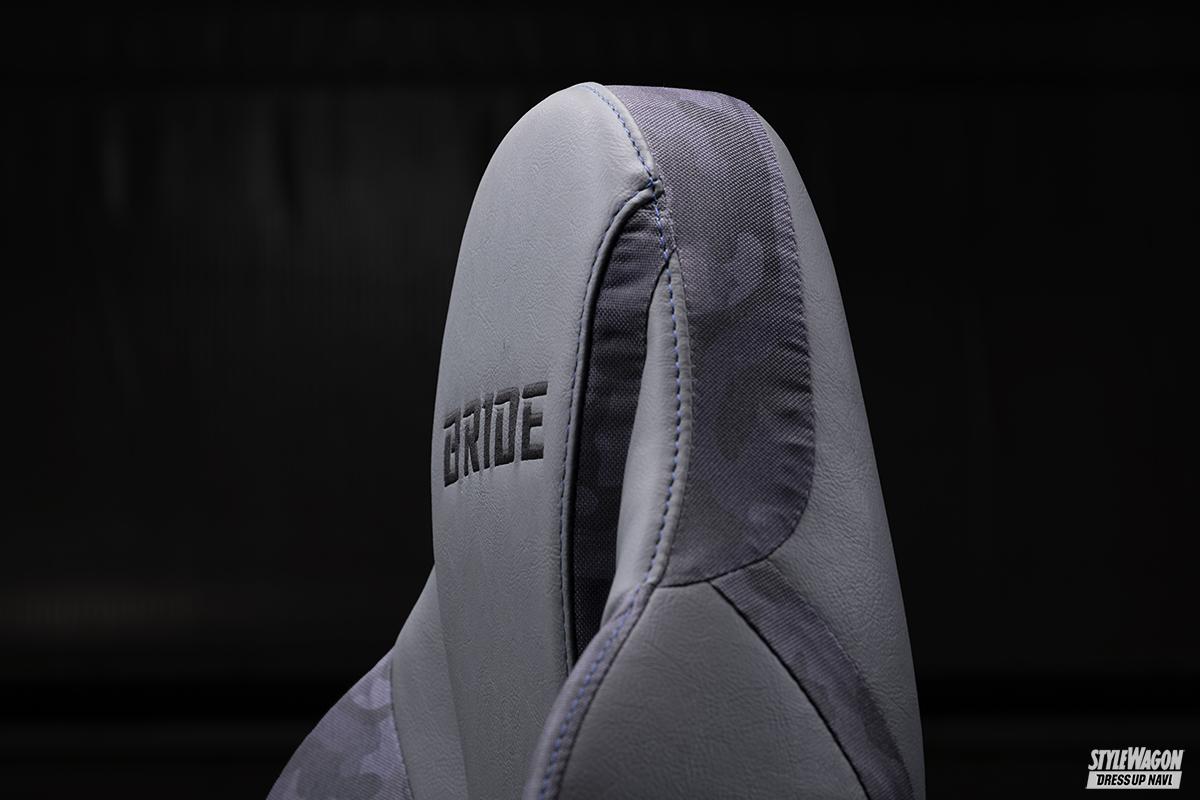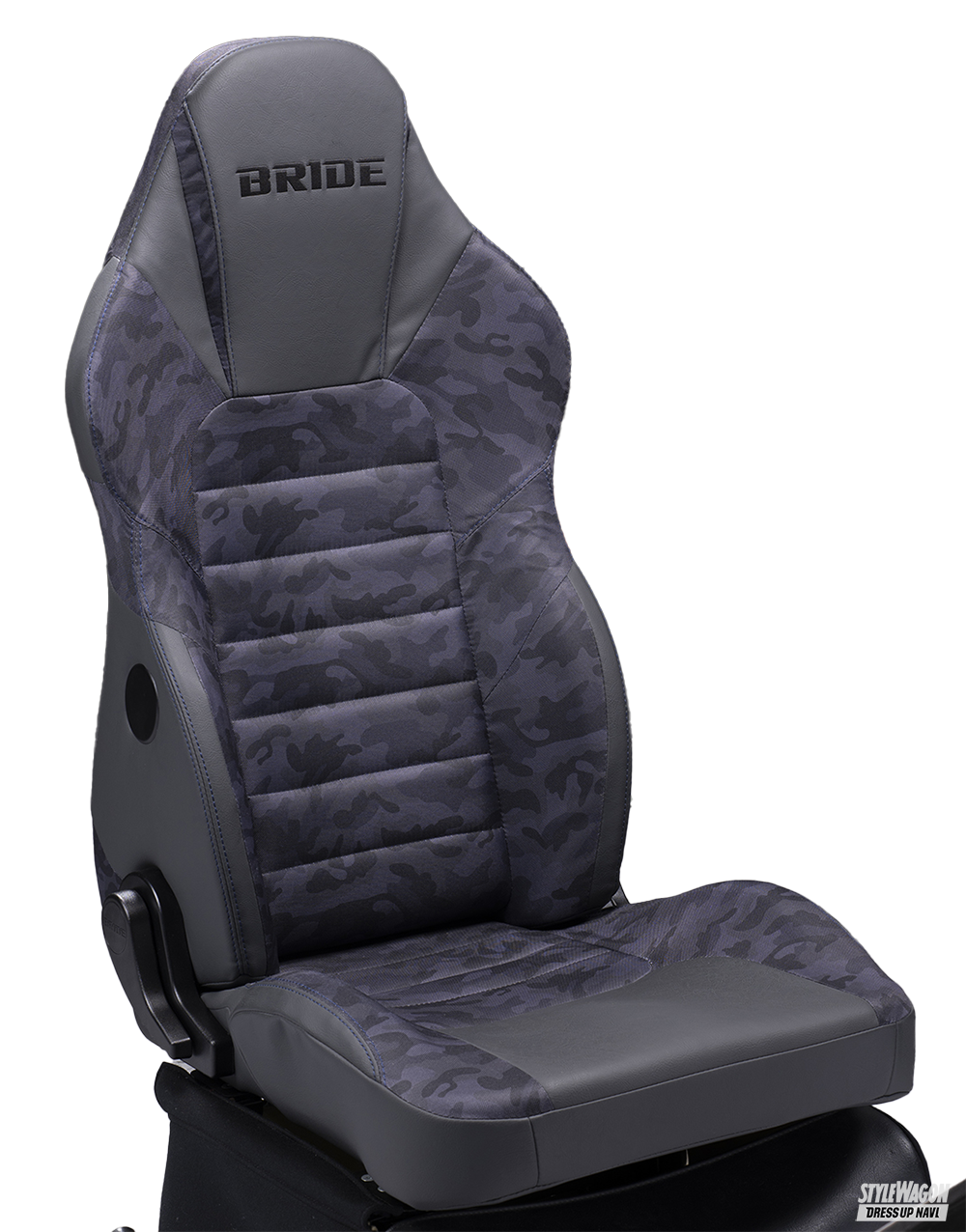 4型以降のナローボディに取り付け可能なブリッド製シートは、エルゴスターの他にストリームスシリーズも選べる。エルゴスターと同程度のショルダー幅で、こちらも身体を適度に包み込んで支える形状となっている。座面の厚さも程よく、長距離運転しても腰やお尻が痛くなりにくいのも特徴。中でも人気なのが、カモフラ柄の生地を採用したストリームスゴーストだ。