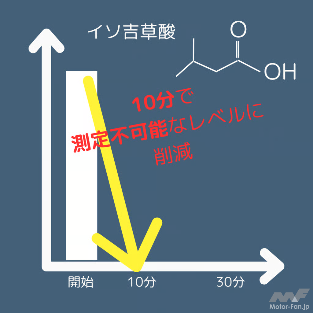 2:上記三大成分の中でも、特に厄介なのが①のイソ吉草酸(いそきっそうさん)。一般的に市販の消臭剤の多くは、イソ吉草酸を消去する成分が含まれていないが、DASHOEは10分で測定不可能なレベルまで削減。
