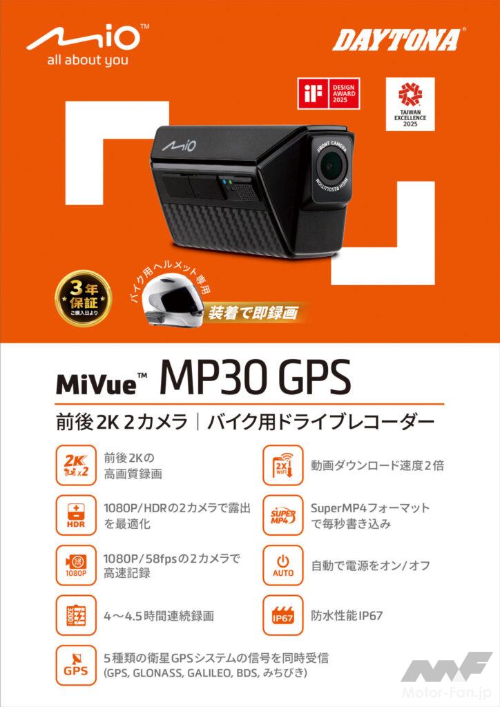 デイトナは、バイク専用ドライブレコーダー「Mio MiVue MP30GPS」を発売した。価格は2万8600円(税込)で、ヘルメット用粘着マウント、USB-TypeCケーブル、クイックマニュアルが付属する。microSDカードは別売りで、最大256GBまで対応(U3/C10/V30以上推奨)。本体サイズは100×47.7×34mm、重量は145gとコンパクトで軽量な設計。ボタン一つで操作が完結し、自動で電源のオン・オフや録画の開始・停止が行われるため、初めてドライブレコーダーを導入するライダーにも扱いやすいモデルとなっている。