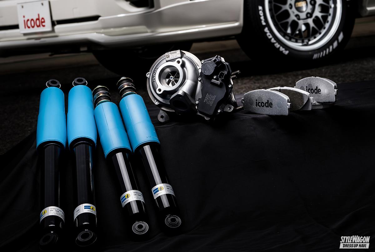 さて、そんなストレスを解消すべく立ち上がったのが、レクサスやポルシェなどハイエンドスポーツの魅力を引き出すことで名高いアイコードだ。同型式のエンジンを搭載するプラドに比べてデチューンされている1GDの潜在ポテンシャルを引き出すべく、チューンドECUとチタンマフラーをプロデュース。さらにダンパーやブレーキパッド、エアロパーツまでも揃え、走りの痛快さ高めるトータルパッケージをハイエースへ構築した。