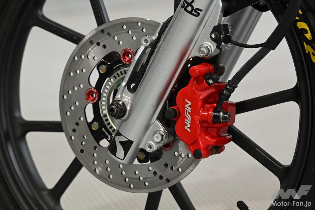 フロント側に装備されるニッシン製の2ポットブレーキキャリパー(2万2000円)は写真のレッドのほか、ブラックとゴールドもチョイスできる。フローティング式のディスクローターはFARとキタコのコラボレーション仕様で参考出品となっている。