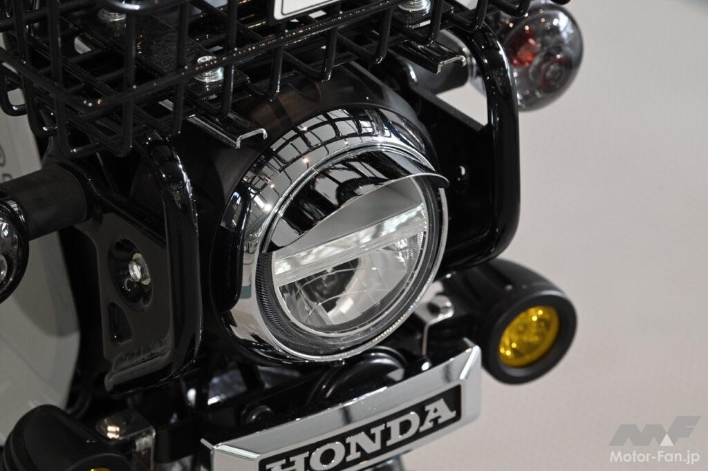 ヘッドライトバイザー(1980円)はクロスカブ以外にもスーパーカブなどにも装着可。ライトの下には「HONDA」と表示するフロントエンブレムKIT(1万3200円)が装着され、メッキパーツで統一感のある仕上がり。