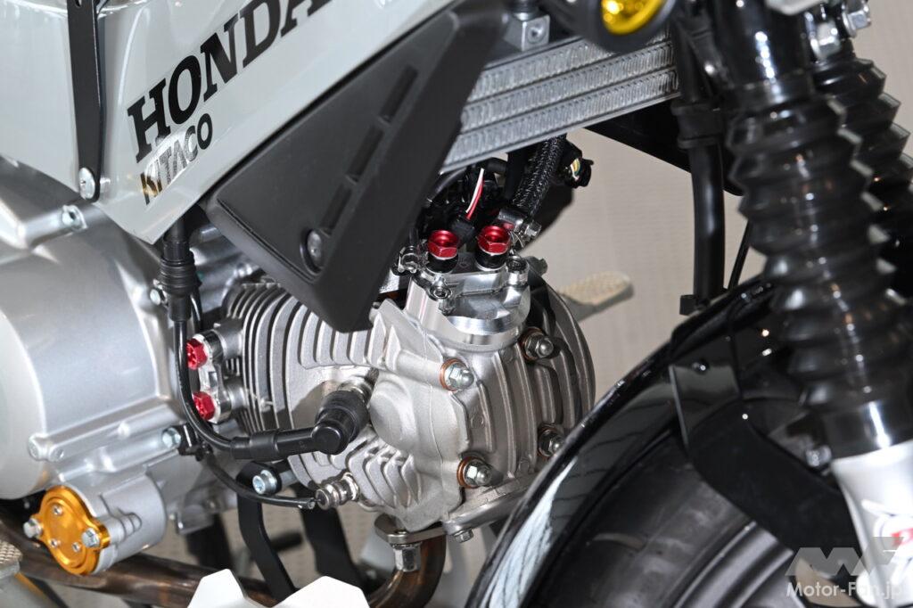リヤサスペンションはキタコとGEARSのコラボレーションアイテム。自由長はノーマルと同じ371mmとし、無段階にプリロードを調整できる。伸側減衰調整は14段階となっていて、車高調整機能によりマイナス2mmからプラス5mmまで調整可能。KITACO×GEARSショックアブソーバー(9万4600円)