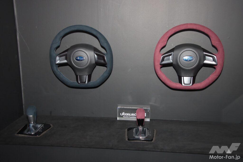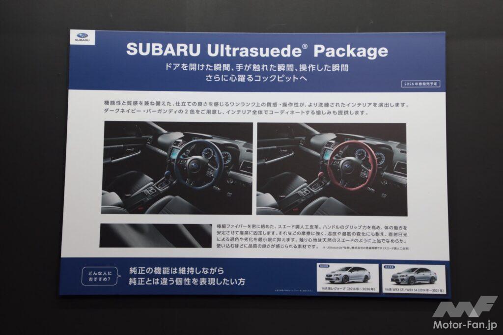 初代の「レヴォーグ」(VM系(2014年6月〜2020年10月))のほか、運転席まわりの設計が共通の初代「WRX S4」(VA系(2014年8月〜2021年3月))も対象とした「ウルトラスエードパッケージ」は、ステアリングホイールのグリップとシフトノブを、表皮に東レのスエード調人工皮革「ウルトラスエード」を用いたものへ交換するというもの。