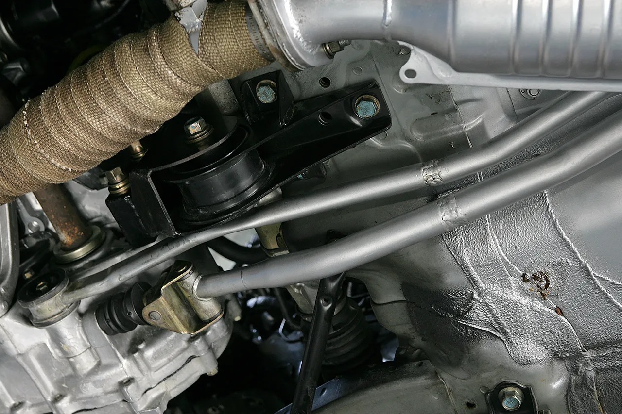 リンケージはインテグラ用の長いものをロゴに合わせて加工。このあたりの流用チューニングは、様々な車種を手がけるトップフューエルだからこそのテクニックと言える。