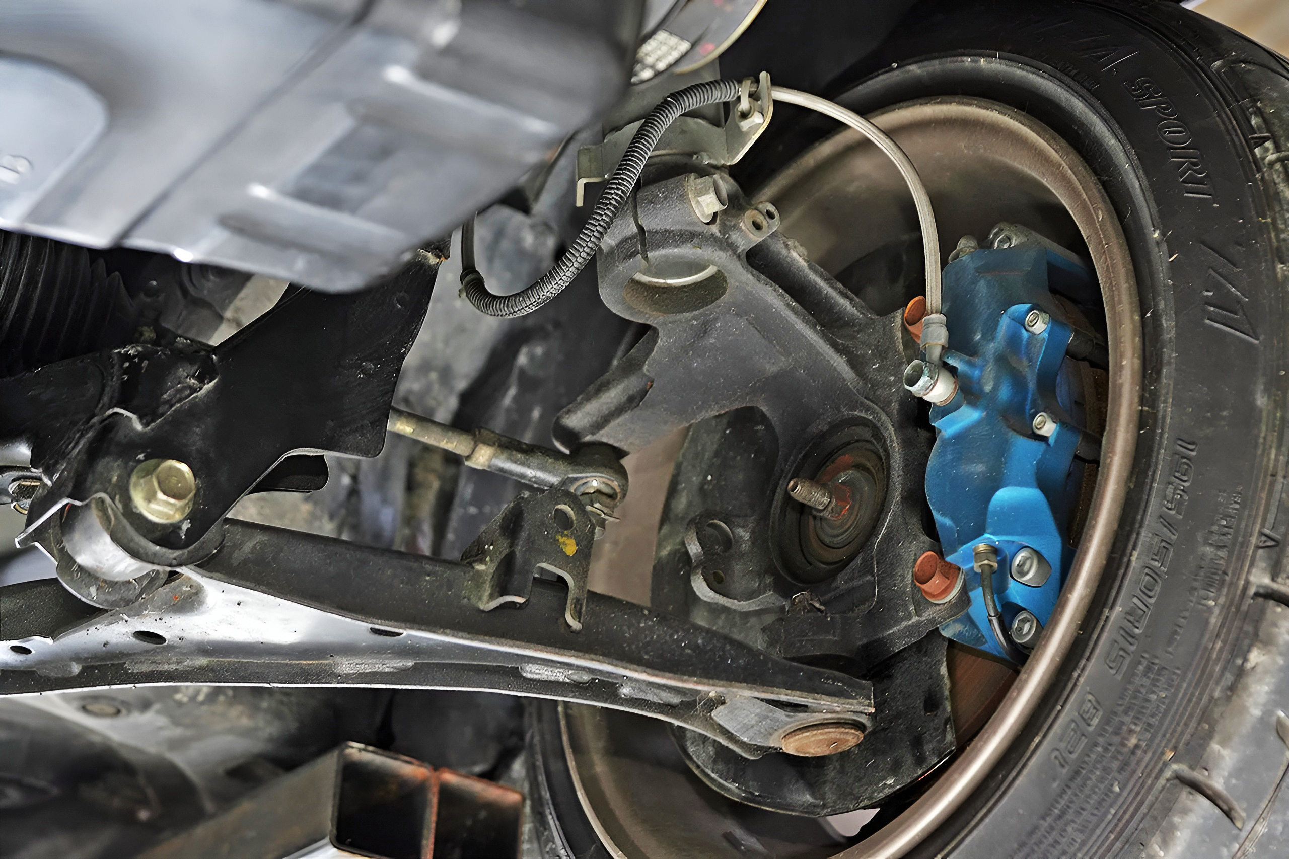 サスペンションはシルクロード製の特注車高調を軸にセットアップ。ブレーキシステムはスプーン製だが、残念ながらロゴ用の設定は無いため他車種用を加工流用した。