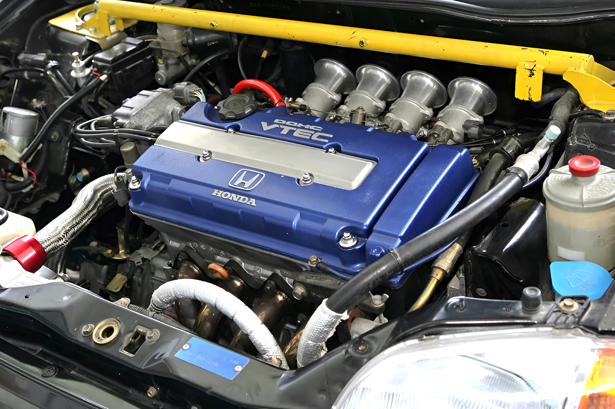 まずエンジンは、DC2インテグラタイプRのB18Cを換装。内部はEK9純正ピストンを流用して圧縮比をアップ。さらに戸田レーシングの4連スロットルやハイカム(300度 12.5mmリフト)を採用し、約250psを絞り出している。