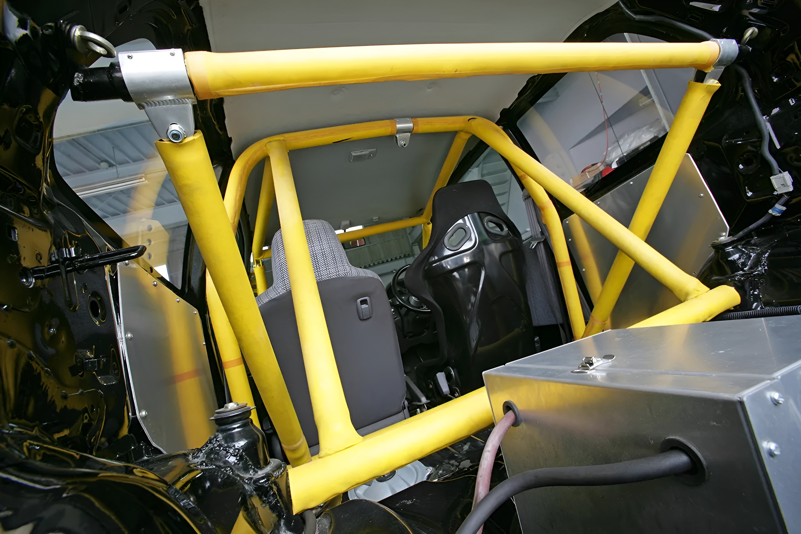 インテリアのメイキングも凄まじい。室内を覆う12点式ロールケージはピラー留めやガゼット補強など溶接で装着。その他、フロアバーの取り付けやスポット増し補強も敢行し、ガチガチの剛強ボディで仕上げられている。