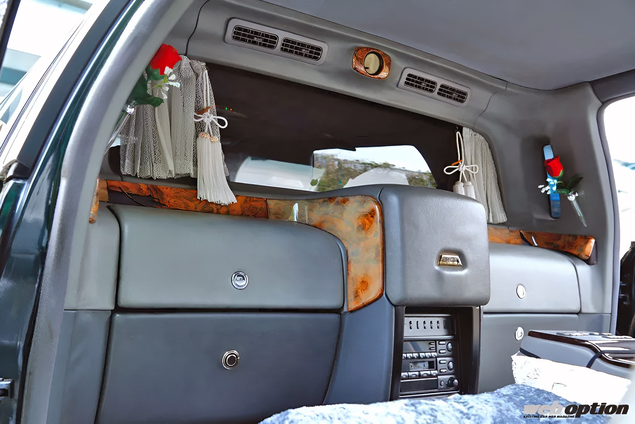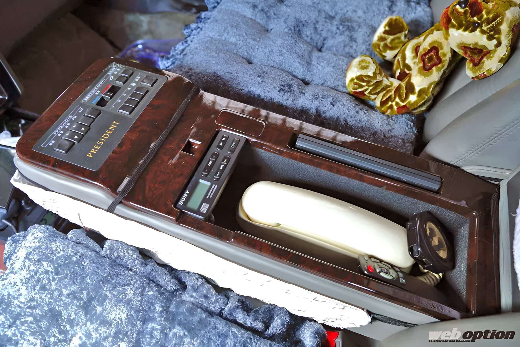VIPが座る後席左側、その目の前には製氷機とシガーソケットから電源を取って使う専用ポットが格納されている。そして、その奥にはオーテックのロゴ入りコーヒーカップが2つ。こんなところにまでプレジデントロイヤルリムジン専用アイテムがあることに衝撃を覚える。もちろん、オーナーは「もったいないから使ってない」とのことだ。