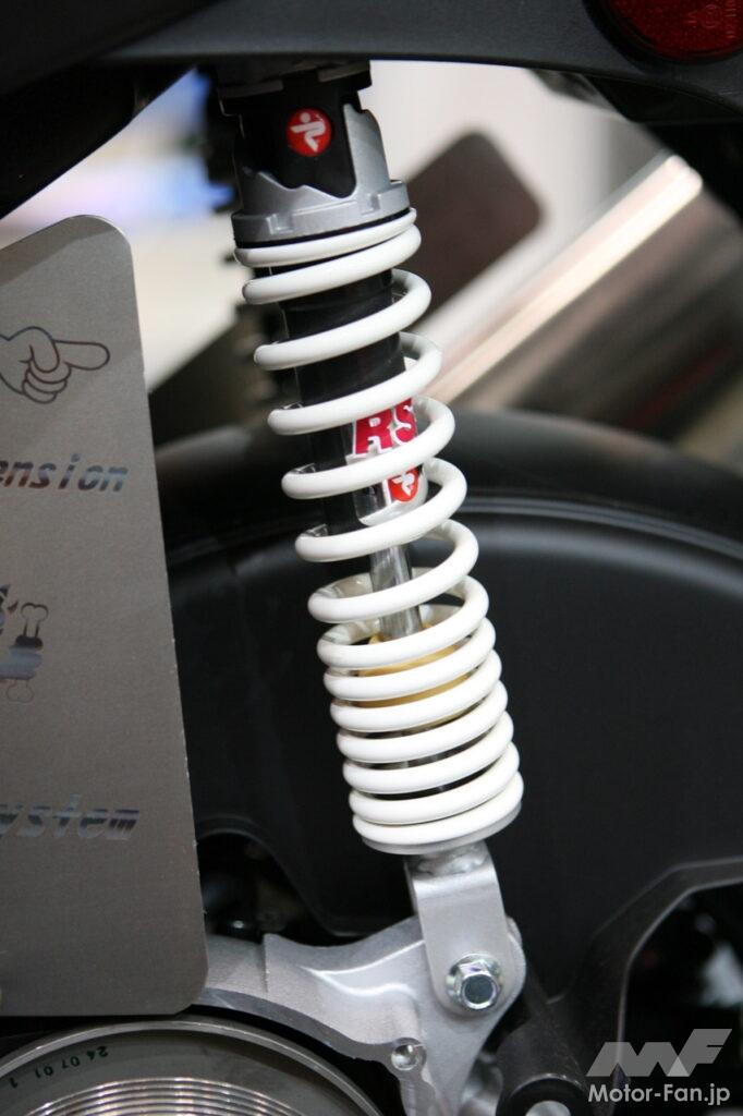 リヤショックはイニシャル調整機能付き。ブラックの本体とホワイトのスプリングが特徴的なPAIOLI製のRS24となる。【レジリエンザジャパン】では、各種ECサイトで並行輸入品と価格を比較して欲しいという。それだけ販売価格に自信を持っているのだ。