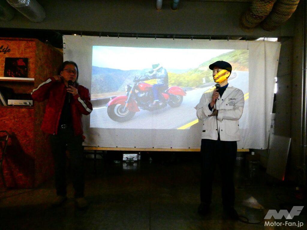 125周年アニバーサリーモデル&チーフビンテージ・ジャパンプレミアではまず、チーフビンテージのプレゼンテーションから始まった。その後、アメリカ西海岸で行われた試乗会に参加した藤原社長と河野正士氏のトークショーが行われた。