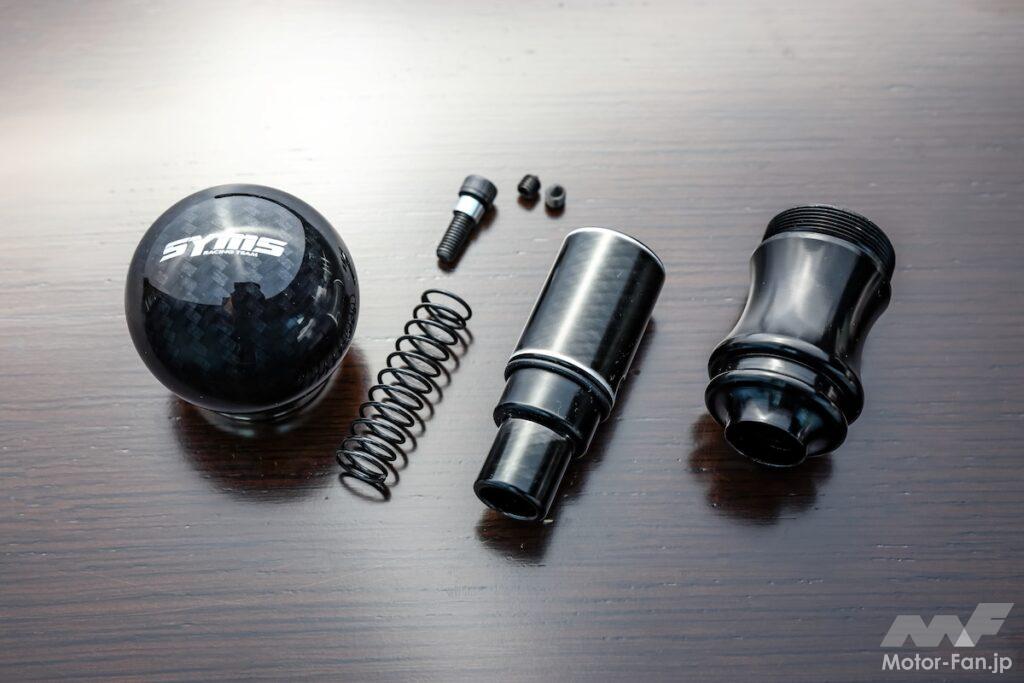 ちょうど手のひらにしっくりくるサイズ感の丸型シフトノブは、質感高いカーボンデザインを採用。そして下にプッシュする力加減も、開発時にいくつもの固さのバネを試して開発したこだわり。ただ丸いだけでなく操作性という部分もしっかり熟慮して開発されているのがシムスらしい部分。