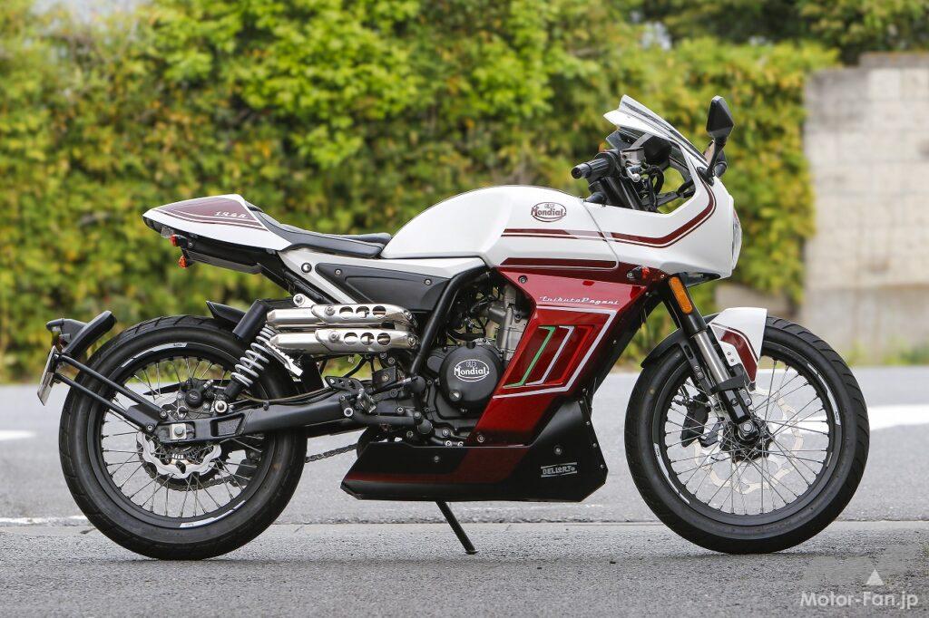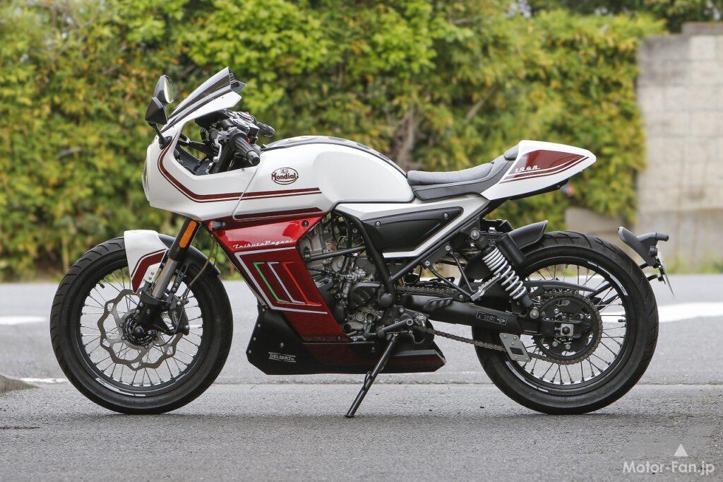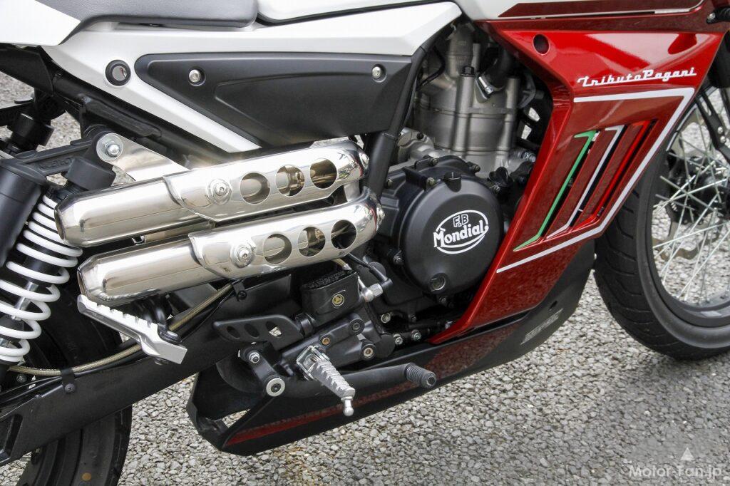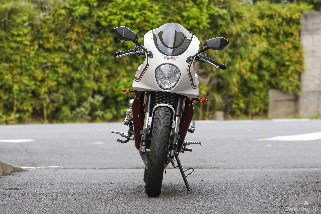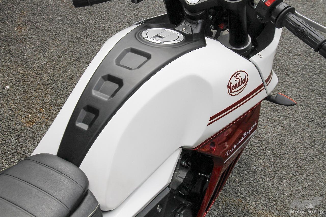 カウルを身にまとったフォルムは実にスポーティでかっこいい。しかもこのスポーツスタイリングは現代的なものではなく、どことなく80年代のカフェレーサーのようなデザインになっています。個人的な話で恐縮ですが、1980年式の125㏄シングルスポーツバイクをカフェレーサー風にカスタムしたモデルを所有している僕としては、このF.Bモンディアル パガーニ300を目の前にしたとき、初対面にもかかわらず親近感を覚えたのです。