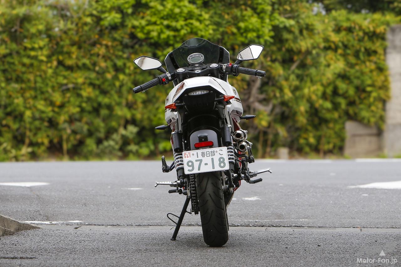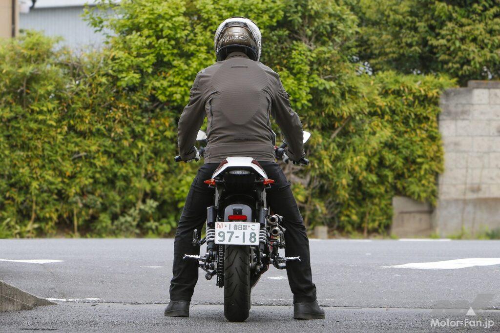 シングルシーターに仕立てられたシートに跨り、セパハンに手を添えると、コンパクトボディながら上体がわずかに前傾し、なかなか好戦的なポジションになります。しかし全体に窮屈なところはなく、街中を走るのに不都合な点はありませんでした。ひとつ気になったのは、右側に取り回されたセミアップの2本出しマフラーが足を下ろしたときに干渉することです。小柄なライダーだと足つきのときにちょっとあせるかもしれません。ちなみに、足つき性に関しては問題ないと感じました。