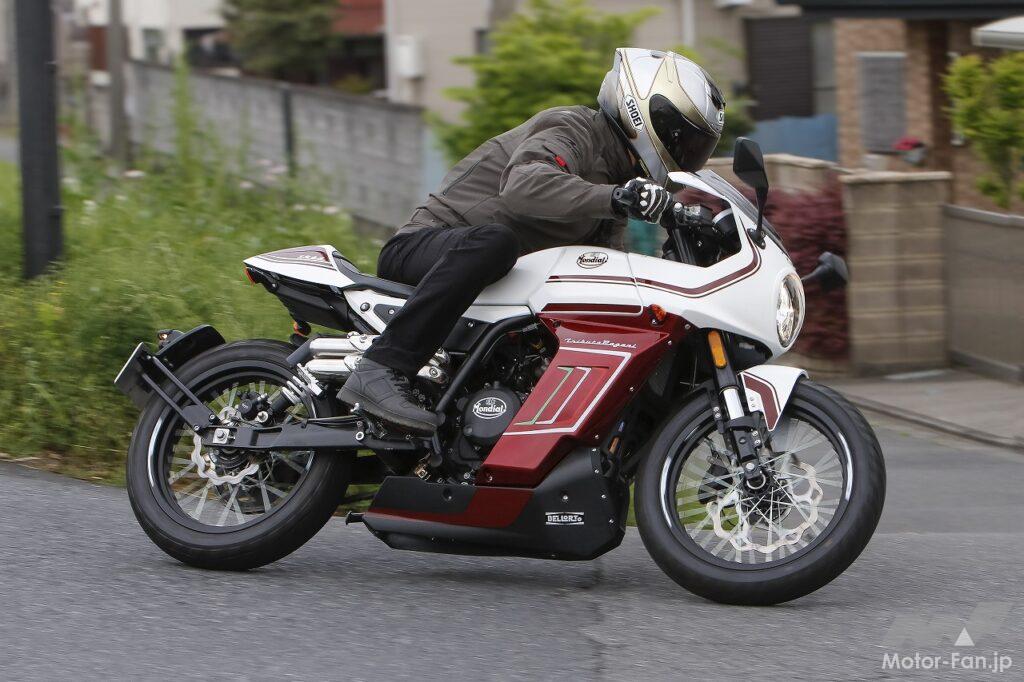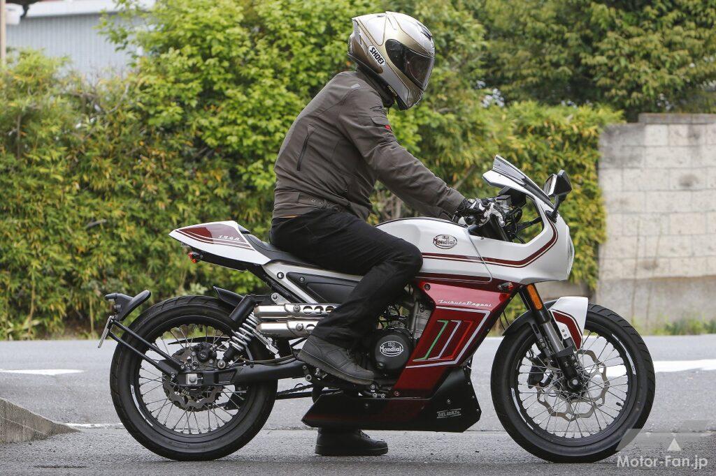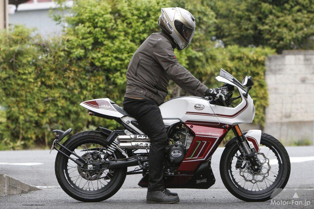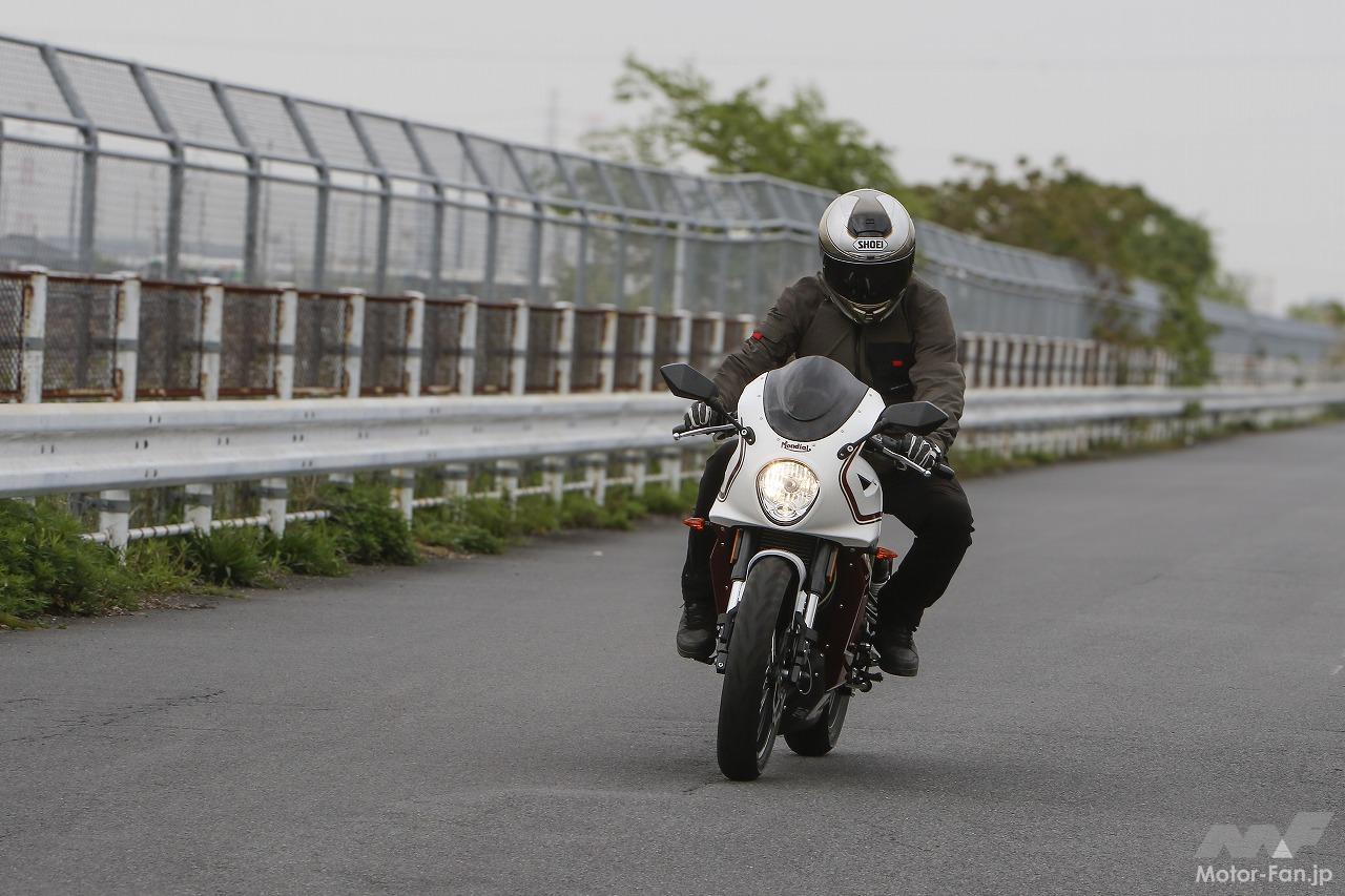 クラシカルなカフェレーサースタイルのボディは車重153㎏と軽量なので、不安なく走りだすことができます。低めにセットされたセパレートハンドルのためハンドル切れ角はあまり大きくなく、フルロックさせるとタンクとの間に手が挟まるので、その辺りは少しばかり気を付けないといけませんが、取り回しに関しては非常にいいと思いました。