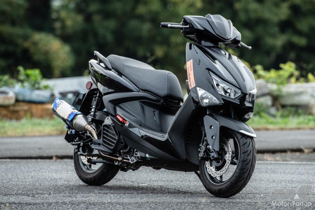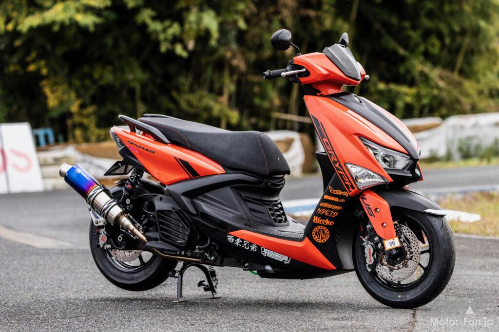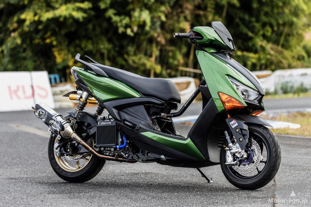この組み合わせで2024年4月に富士スピードウェイで初開催されたモトチャンプ最高速チャレンジでは142.480km/hを記録。スクーターミーティングでもドラッグレース【SS1/32mile】で4秒197を記録。ちなみにフロントのフローティングディスクと前後キャリパーはフランド製で、リヤショックはシャークファクトリー製となっている。