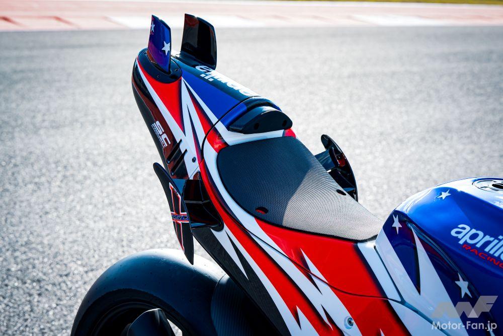 すべてのフェアリングは、PAN Compositi社によるカーボン製で、MotoGPバイクと同じ製法で作られている。直線走行時の垂直荷重はAprilia RSV4の5倍で、安定性が向上してウィリーが軽減される一方、コーナリング時の荷重は3倍となり、グリップ力が向上している。このフェアリングはアメリカ国旗の色をあしらった「星条旗」カラーが施され、この特別なバイクの個性を際立たせる。