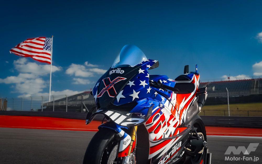 アメリカ国旗をモチーフにした壮大な「星条旗」カラーリングをまとったAprilia X 250THは、240馬力を誇る、これまで製造された RSV4 の中で最もパワフルなモデルだ。