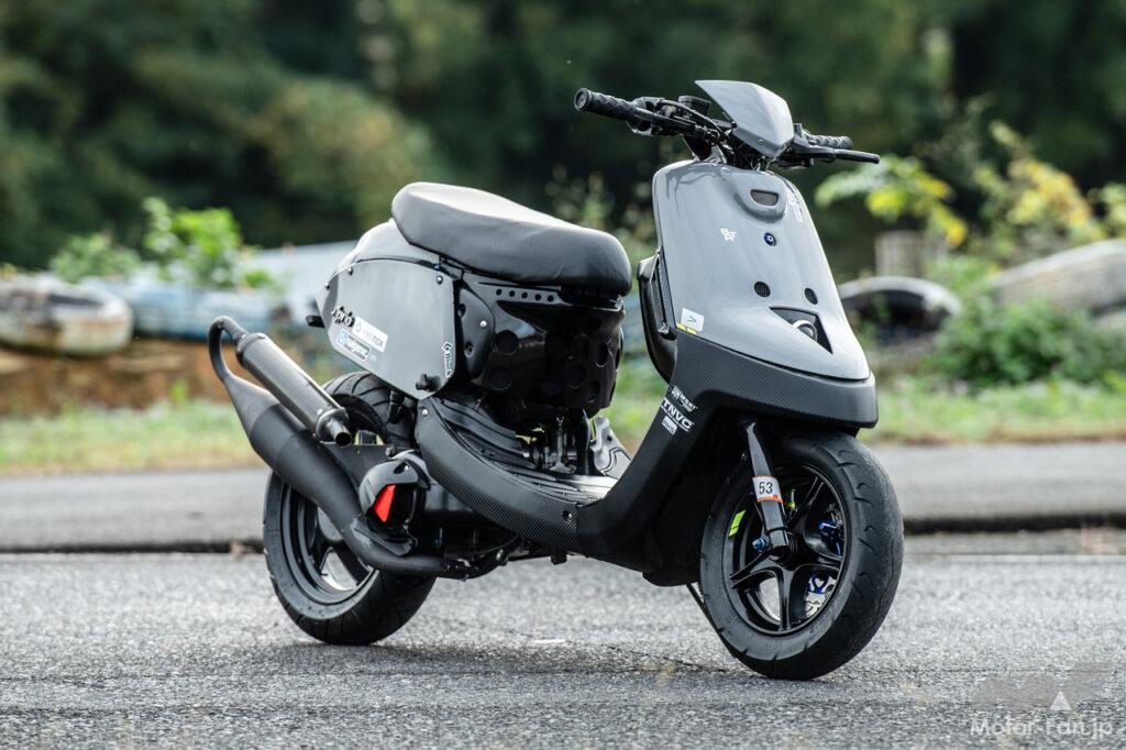 テールカウル一体シートやフレーム剛性を高めるサブフレームどを装着。徹底した軽量化を突き詰めたモディファイで“ヤル気”全開! パワー重視の吸排気系統と綿密な駆動系調整により、50.29mで争うSS1/32mileドラッグレースで50cc未満のSAクラスで好タイムを連発。