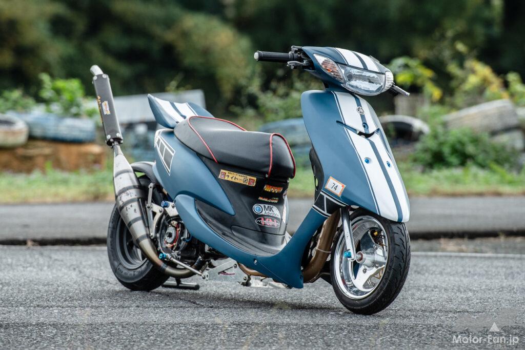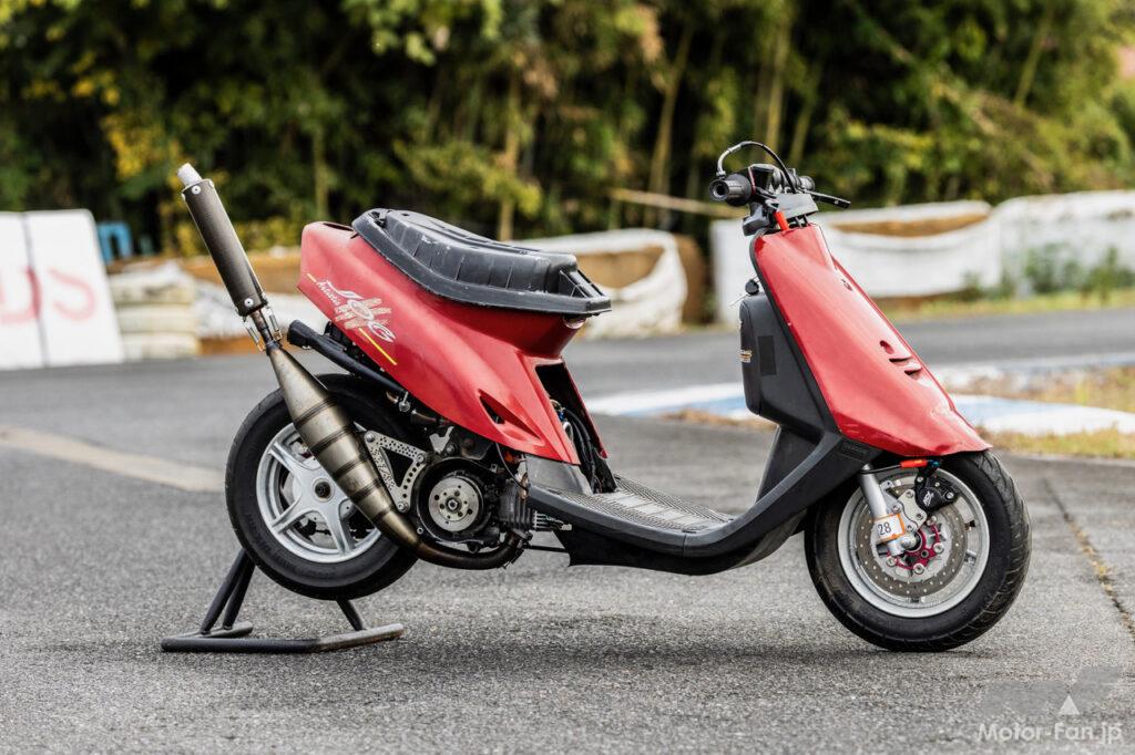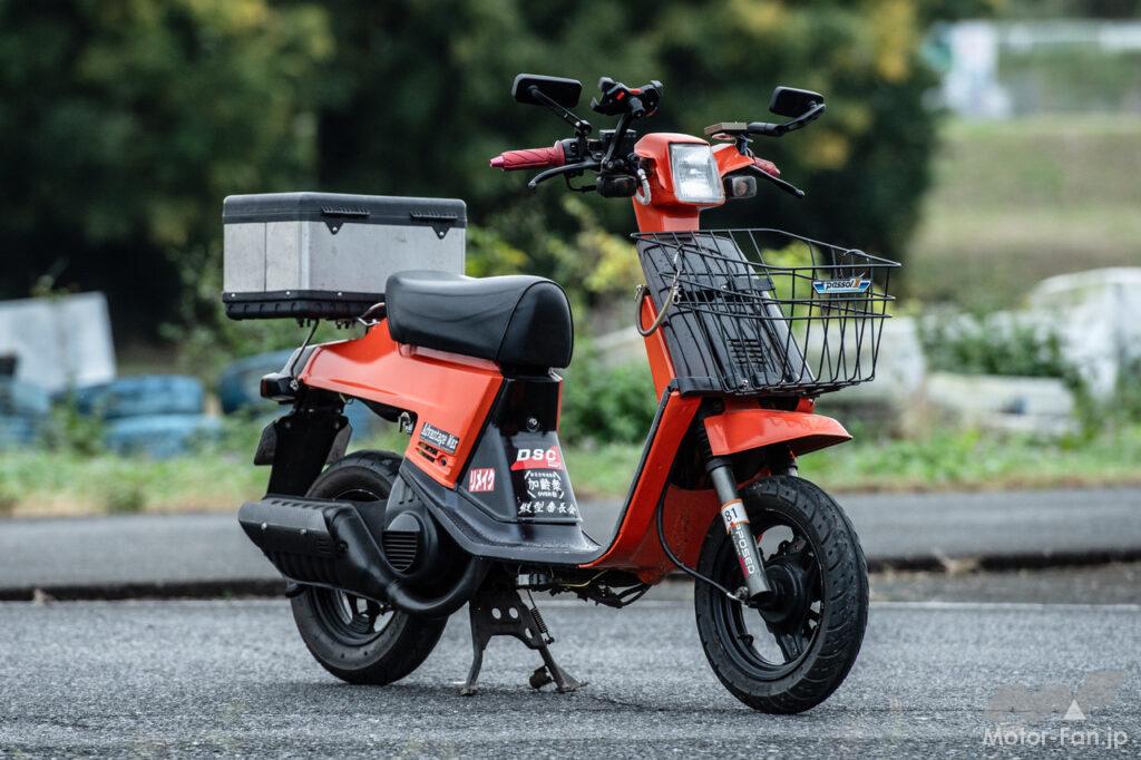 前カゴ内のラジエター&フレーム下部に沿わせたウォーターパイプが示す通り水冷ヘッドでパワフルな心臓部とし、ハンドル周りはJOG ZR用に入れ替え、リヤホイールは当時のミニバイクレースでも使用するライダーが多かった剛性の高いアクティブ(ヤマハ)純正のアルミ製を採用する。フロントフォークやホイール、スポーツマフラーも採用したカスタムメニューがさりげなくて好印象。