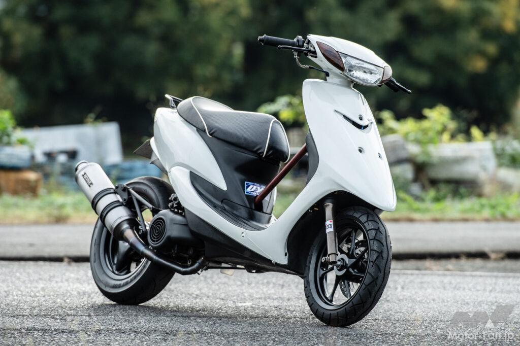 BW’S100用エンジンに載せ替えて12インチ化。マルファーはリバイブ製をセット。チンボーンに加え、スズキNEXの12インチホイールでインチアップとプチワイド化しているのが好印象!
