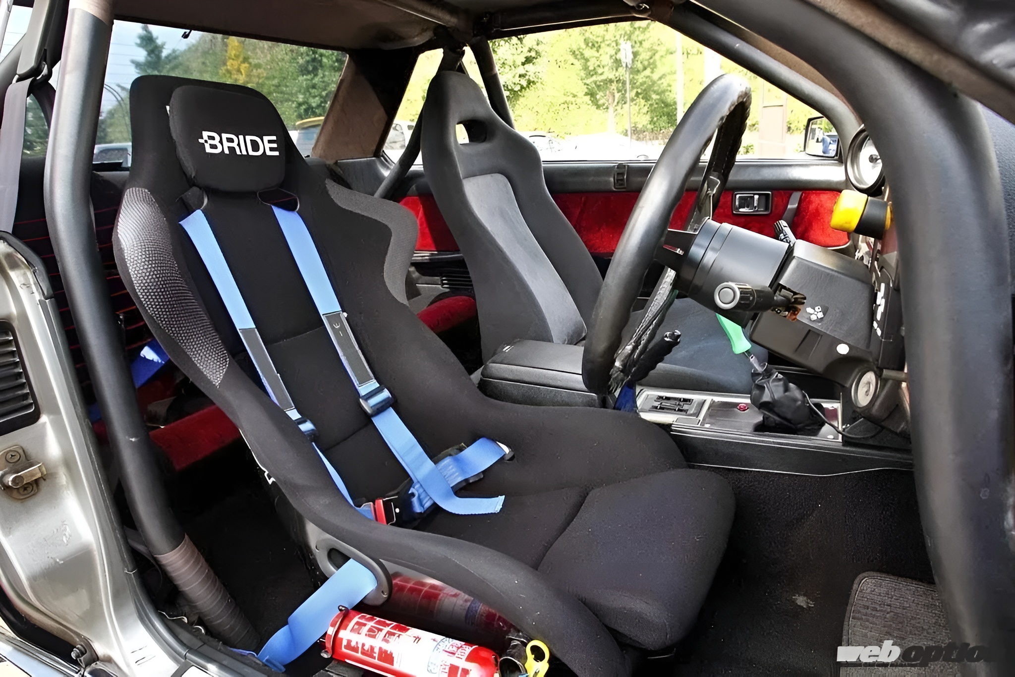 運転席はブリッドのジータ、助手席はBNR32純正に交換。センターピラーレス構造によるボディ剛性不足を解消するため、6点式ロールケージも組まれている。