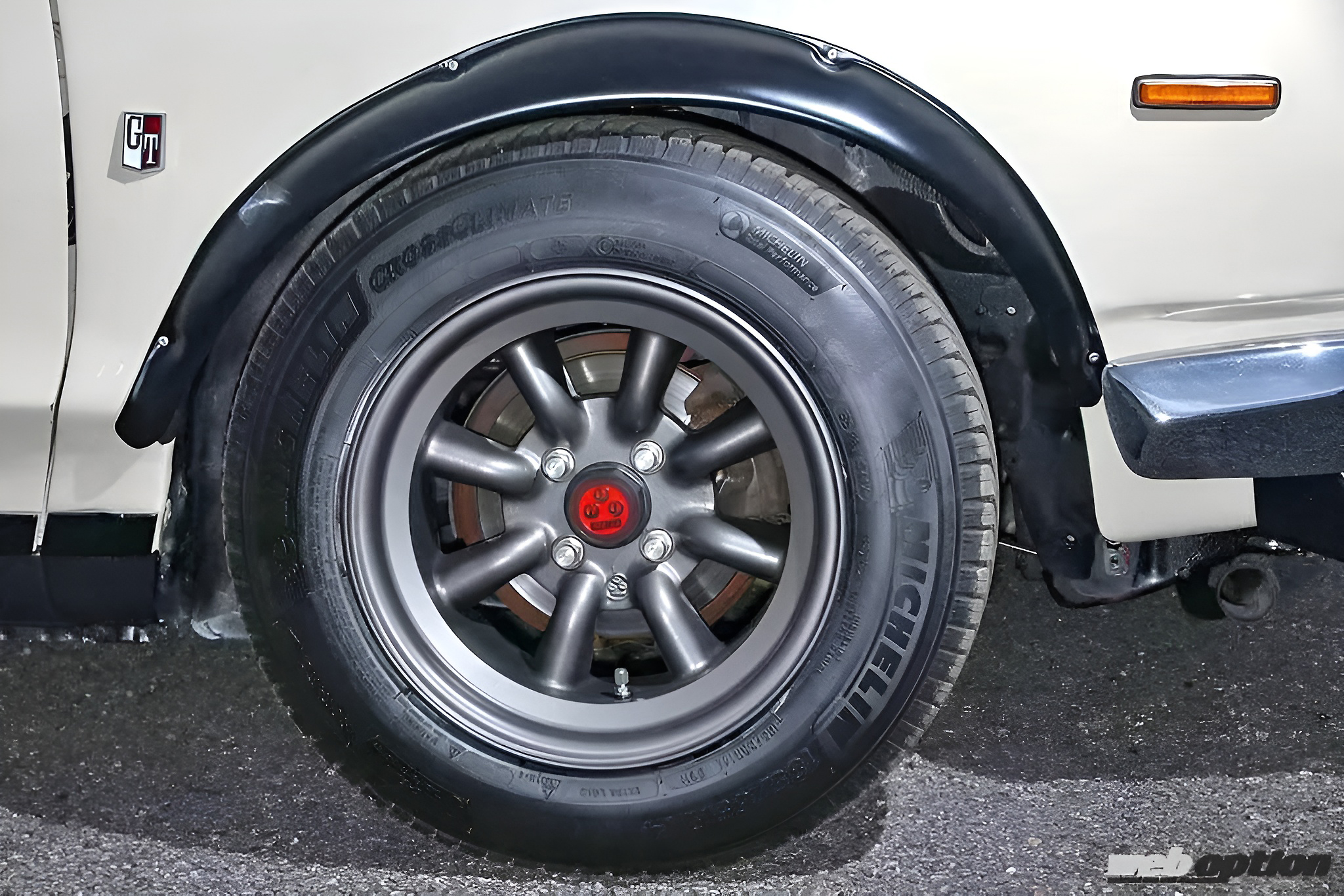 ホイール&タイヤは14インチのRSワタナベ8スポーク(FR7.5J)にミシュラン(FR185/65)という組み合わせ。ビス留めタイプのオーバーフェンダーもベストマッチだ。