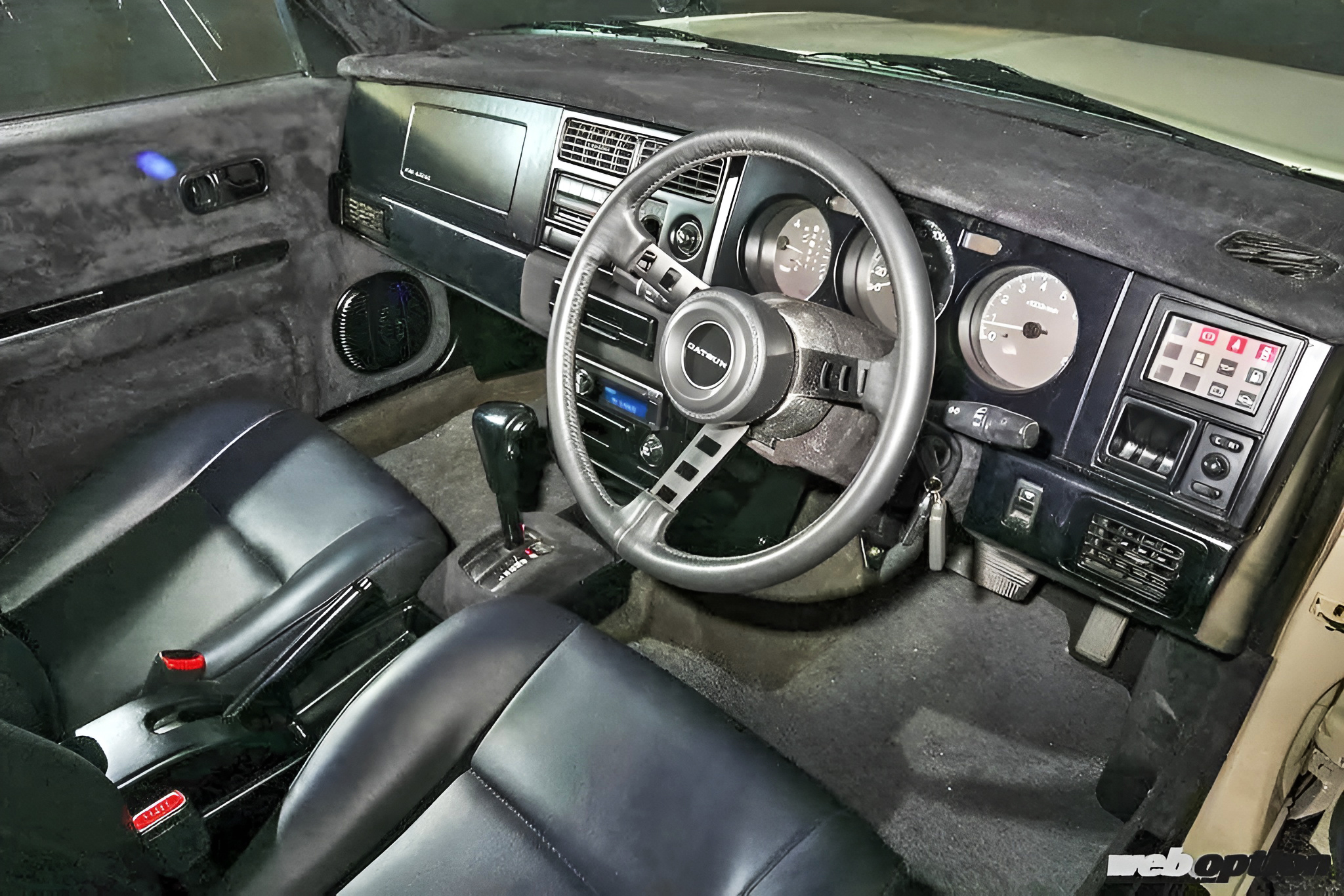 インテリアは黒基調で統一し、シートにはレザーカバーを装着。ダットサンコンペのステアリングも旧車感を引き出す重要アイテムだ。