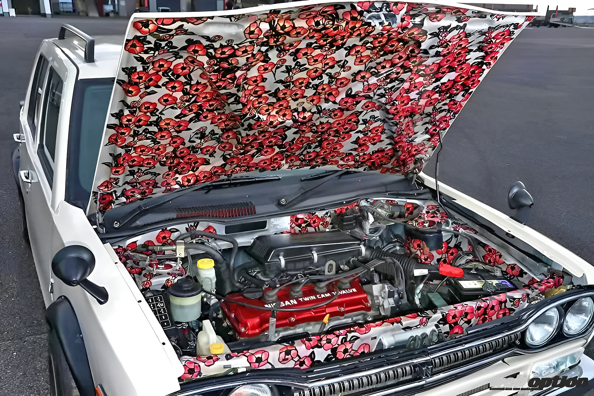 開けてビックリのエンジンルームは花柄仕上げ! これは、女子生徒がコツコツとハンドメイドで描いた大作とのこと。GA15DEエンジンやドライブトレインはノーマルとなっている。