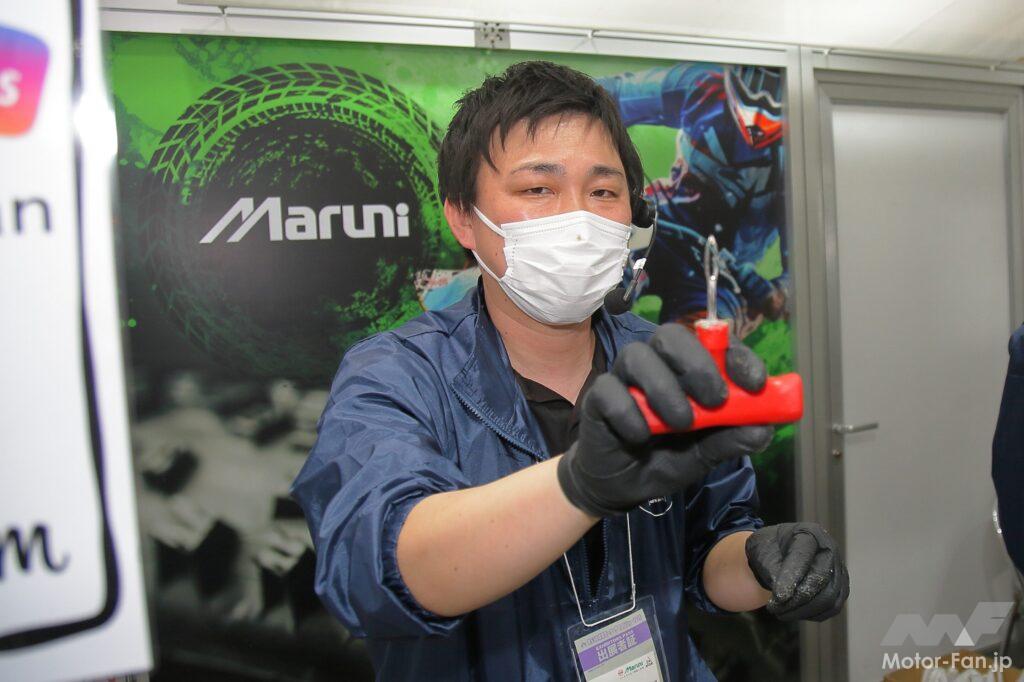 さて、そんな悲劇から華麗に復活できるのが『パンク修理剤』だ。出先でパンクしても修理して再び走行できるのなら天国と地獄の差がある。マルニ工業はパンク修理専門の珍しいメーカーでバイクのほかにクルマや自転車、トラックや重機用などまで幅広く取り揃えている。東京モーターサイクルショー2026のブースでは実際に修理の実演を行い、来場者から注目を集めていた!
