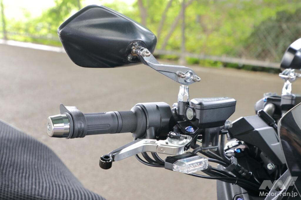 左右のブレーキレバーはキムコの純正アクセサリーを使用してアジャスタブルタイプに変更。アルミ製鋳造のレバーがアルミ削り出しとなることで高級感もプラスされている。位置を自在に調整できるバックミラーはナポレオンのシャークミラー3。小型のウインカーはKRV180TCSのオリジナルだ。