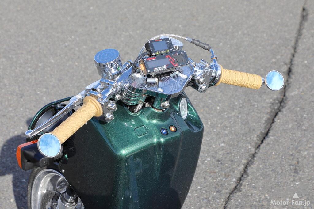 ハンドルポストやハンドルにはメッキ処理されたアイテムが盛り込まれ美しさを奏でる。メーター系はaRacerで揃えられており、低さを追求したバーエンドミラーも小型でクール。
