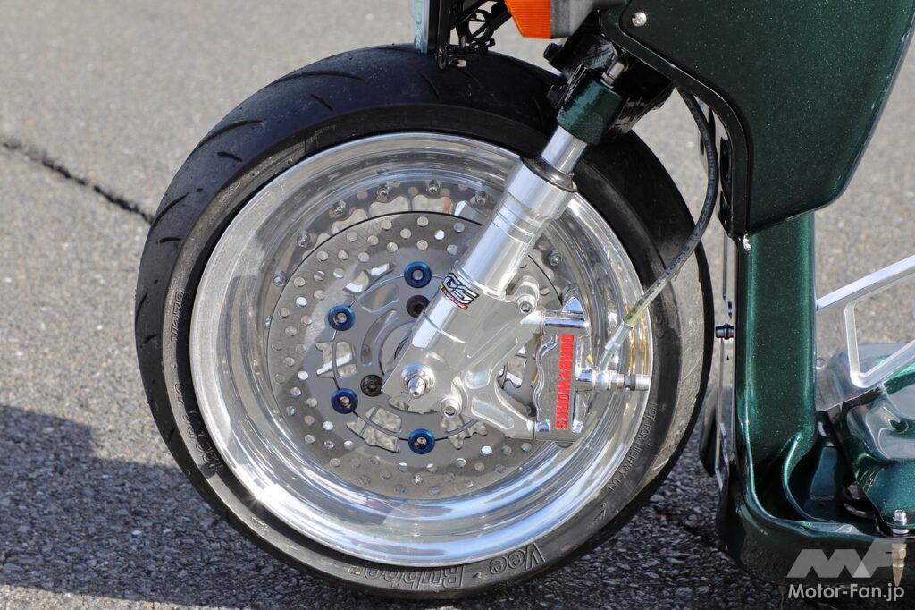 4J幅のアルミホイールやRRGS製フロントフォークをチョイス。フローティング式のディスクローターにはドルビーワークス製のラジアルマウント式キャリパーを組み合わせている。