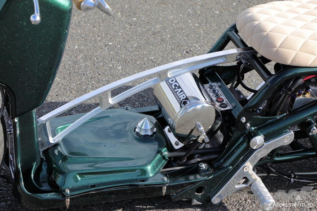 駆動系カバーを見れば一目瞭然だが、ズーマーでは珍しいシグナスXのエンジン換装となっており、駆動系カバーもフレームと同色にペイント。リヤにもエアサスが仕込まれており、車高を自在に調整可能だ。