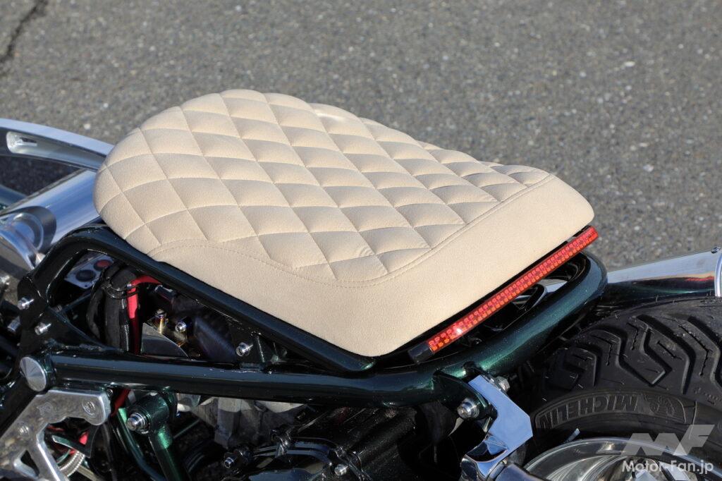 ベージュのシートがセンスの良さを感じさせる。ウインカーも内蔵したテールレンズは超薄型のアイテムを採用。