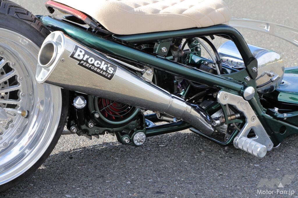 独特の形状を持つBrock’s PERFORMANCE製のサイレンサーを使用し、O2センサーも装備するエキパイはワンオフで作成。