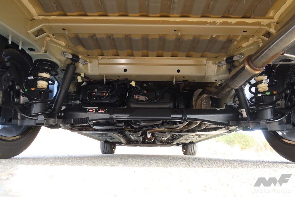 いつものクセでリヤバンパー側からフロア下を覗いたが、なかなかの見ものだった。ぶっとい鉄骨をトラス構造で組み上げた橋を見るようで、構造美すら感じる。リヤサスペンションはパワートレイン横置き前輪駆動車の定番ともいえるトーションビーム式。ダンパーの車体側取り付け点が丸見えでおもしろい。「こんなのでいいの?」と思わずにいられないほど素っ気ないが、「いいんだよこれで。オレたちプロなんだから任せとけ」とでも言いたげな自信すら感じる。