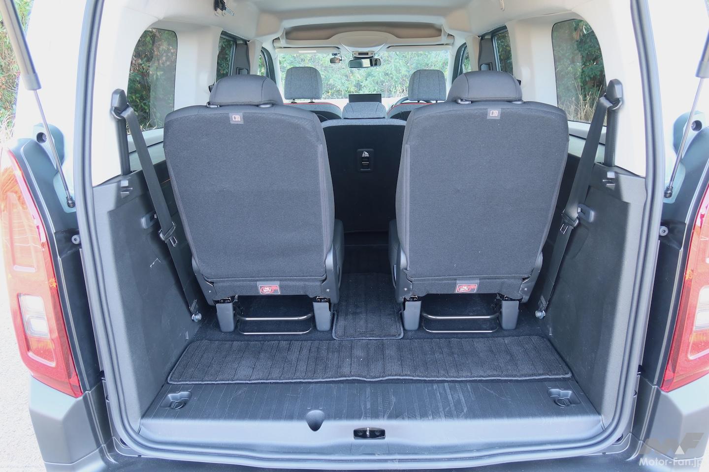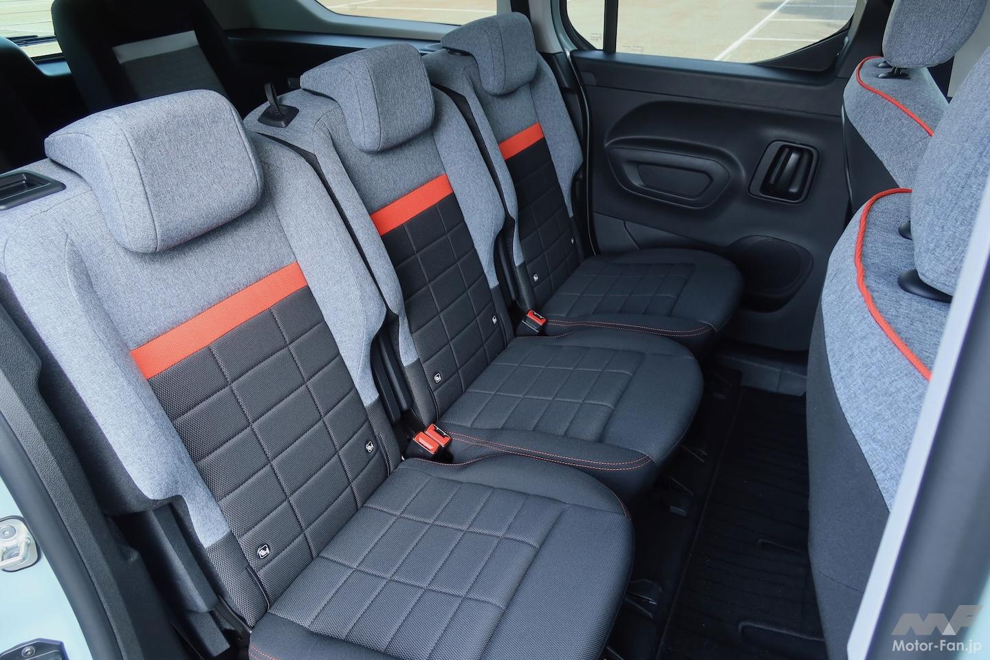 シートはC3とも共通する板チョコパターンで、オレンジのラインがいいアクセントになっている(3列目シートは例外)。ゴージャスというよりカジュアルなムード。シートのクッション性は1列目>2列目>3列目の順に落ちていくが、3列目もしっかり使える印象だ。(脱着できる)3列目までしっかり使っても、荷室には280mm程度の奥行きが残る。