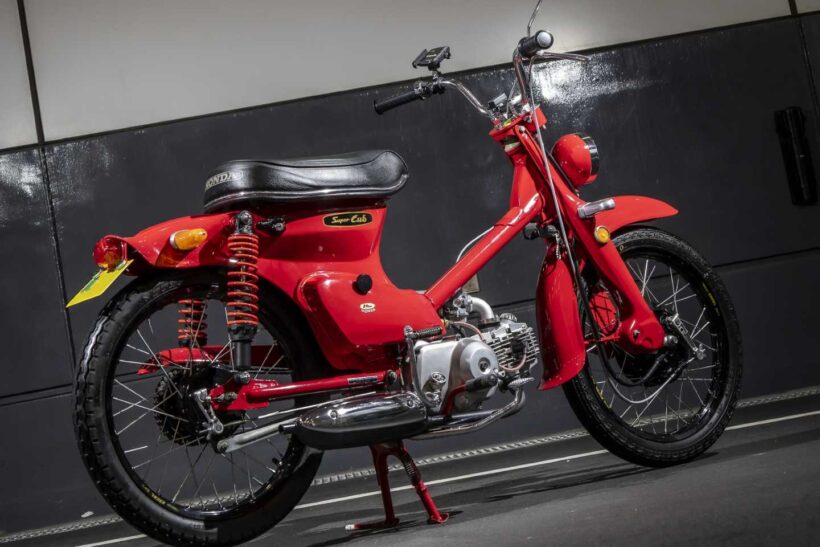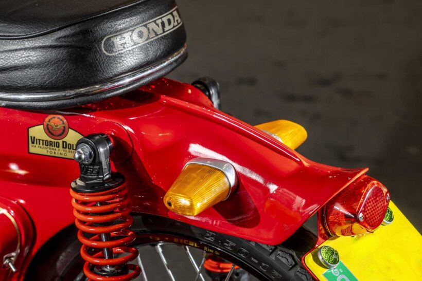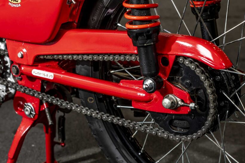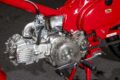 バイクカスタム これぞ王道カブカスタム!ミラノレッド×旧車パーツで仕上げた一台【スーパーカブカスタム】【写真・4枚目】 イエローレンズのヘッドライトはトラック用フォグランプを流用。透明のジェネレーターカバーなど、細部まで作り込みが光る。 角度を付けたショートフェンダーにスポーツカブ用ウインカーを組み合わせ、YSS製リアショックは赤/黒をチョイス。 81cc化したエンジンはモンキーRのミッションを組み合わせたクロス気味の4速仕様。CB750Kのタペットカバーがレトロな雰囲気を強める。 CB50用スイングアームを流用し、ピボット部にはニードルローラーベアリングを内蔵。スムーズな足まわりの動きを実現している。 この画像の記事を読む