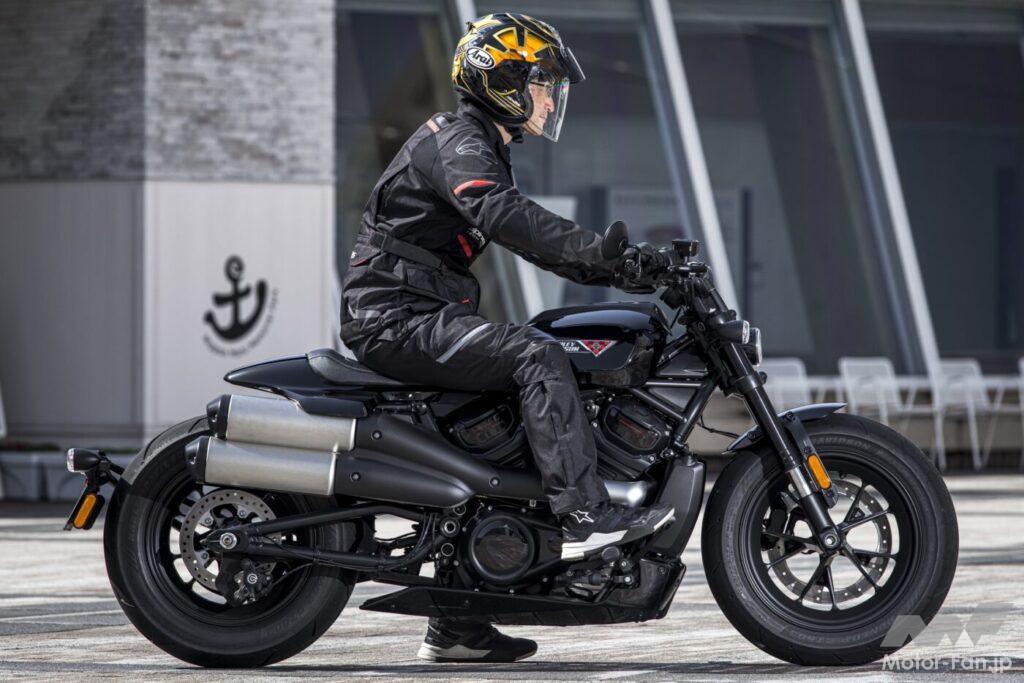 レインモードは、スロットルレスポンスが全域で穏やかになるものの、1252ccVツインのトルクはそうそう簡単に減らせるものではなく、C-TCS(コーナリング強化トラクションコントロールシステム)やDSCS(ドラッグトルクスリップコントロールシステム)、エンハンストリフト抑制機能などがライダーを優しくフォローしてくれる。サイレンサーがライダーに近いこともあり、耳に届くエキゾーストノートは図太くも洗練されており、この独特なサウンドもスポーツスターSをモダンに感じさせる要因の一つになっている。