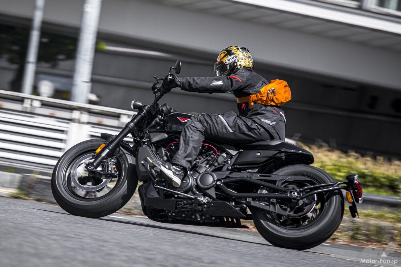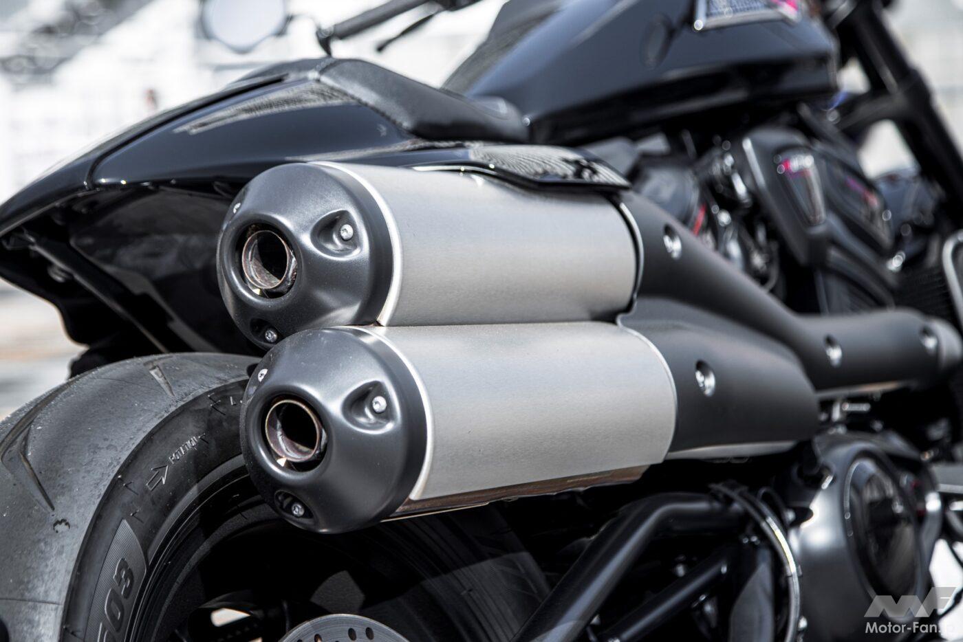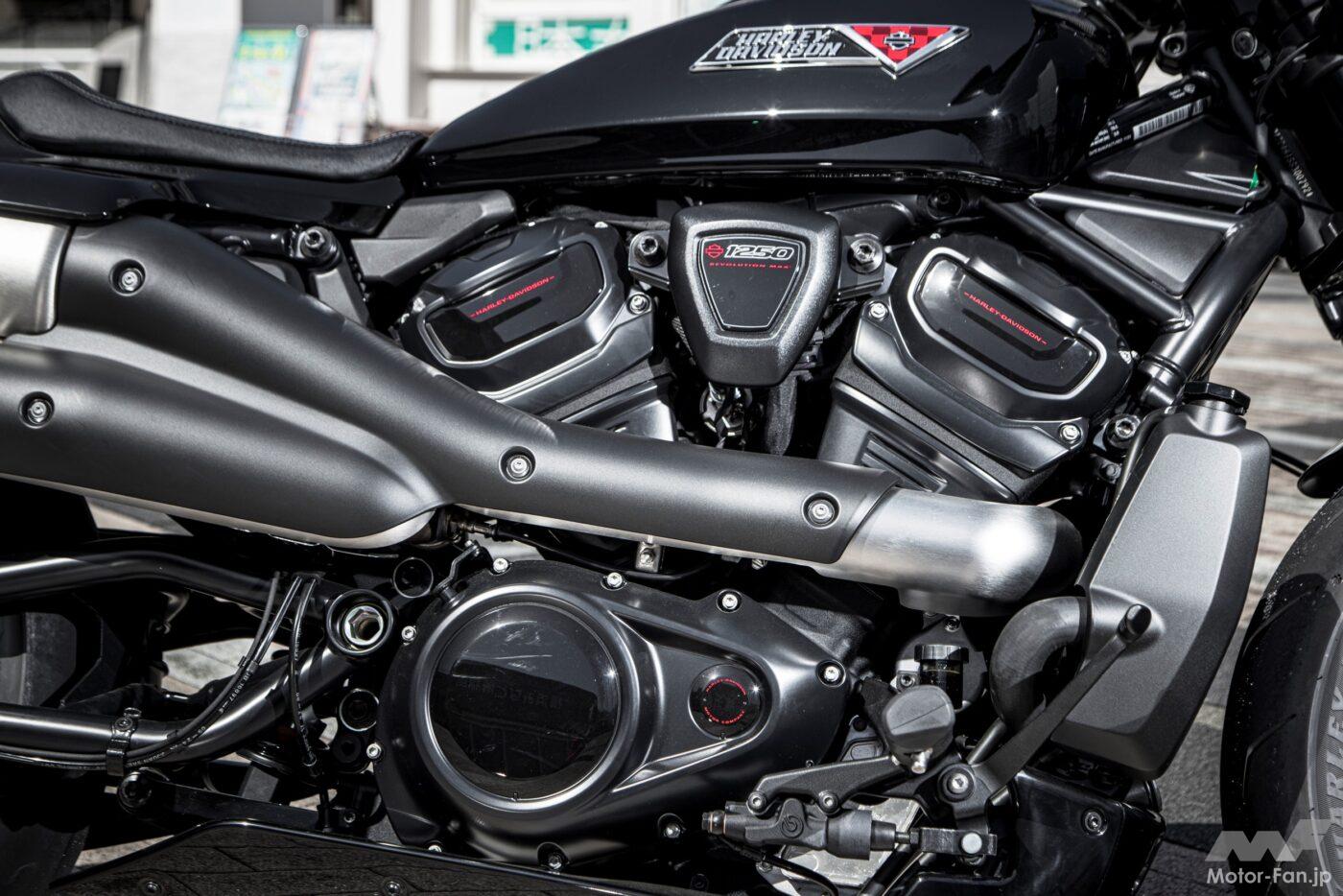 かつてのV-RODシリーズも水冷60度V型2気筒だったが、実際に走り始めると雰囲気がやや異なることに気付く。それもそのはず、このエンジンはクランクピンを30度位相させることで、90度Vツインと同じ爆発間隔になっているのだ。これを聞いたとき、「同じ手法でハーレー伝統の45度Vツインを仮想的に作ることも可能なんだろうな」と思ったが、それをしなかったのは90度Vツイン(もしくは270度位相クランクのパラツイン)の爆発間隔に何らかのメリットがあるからだろう。