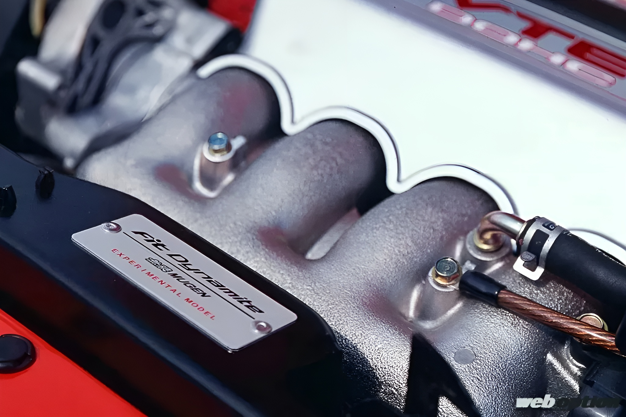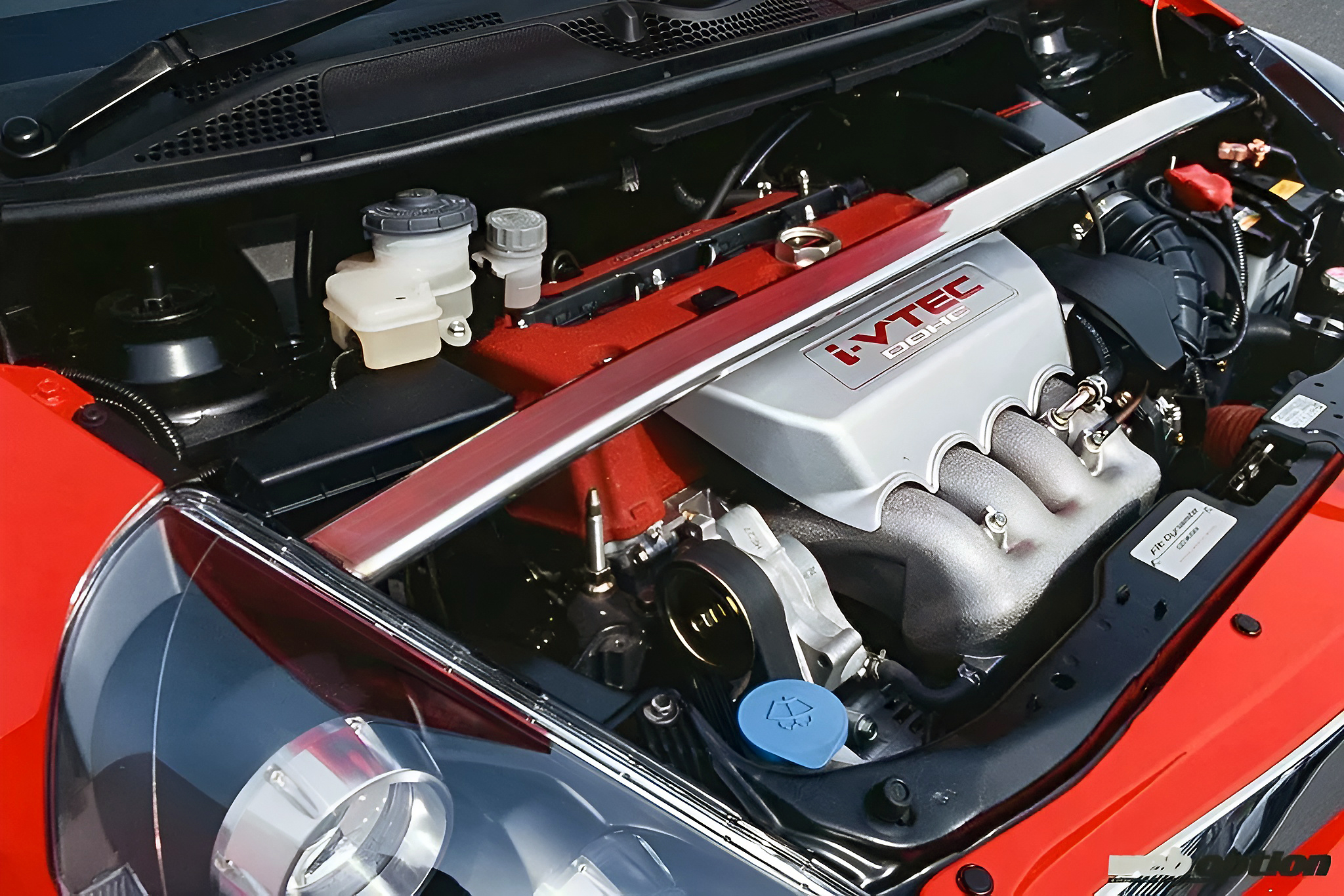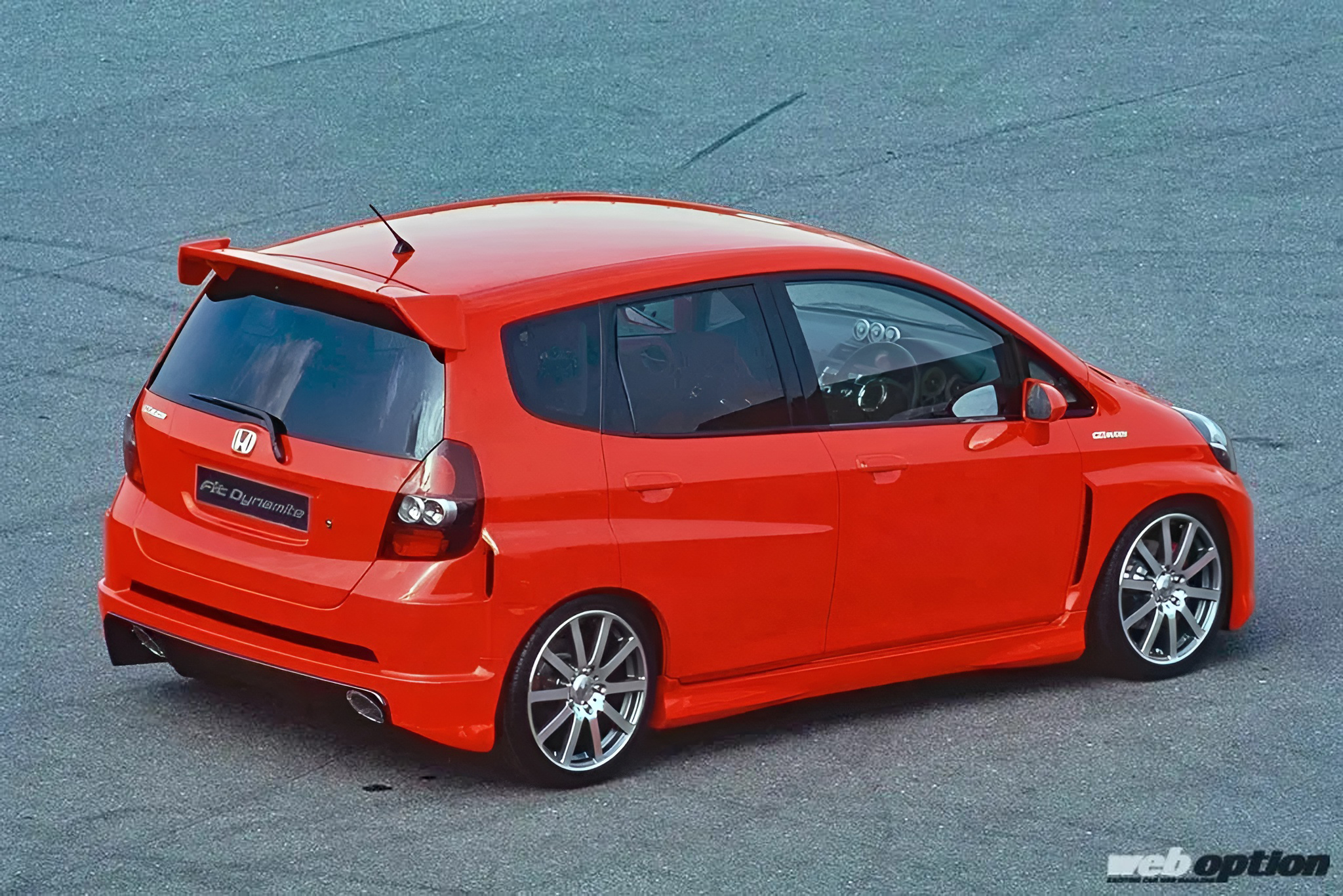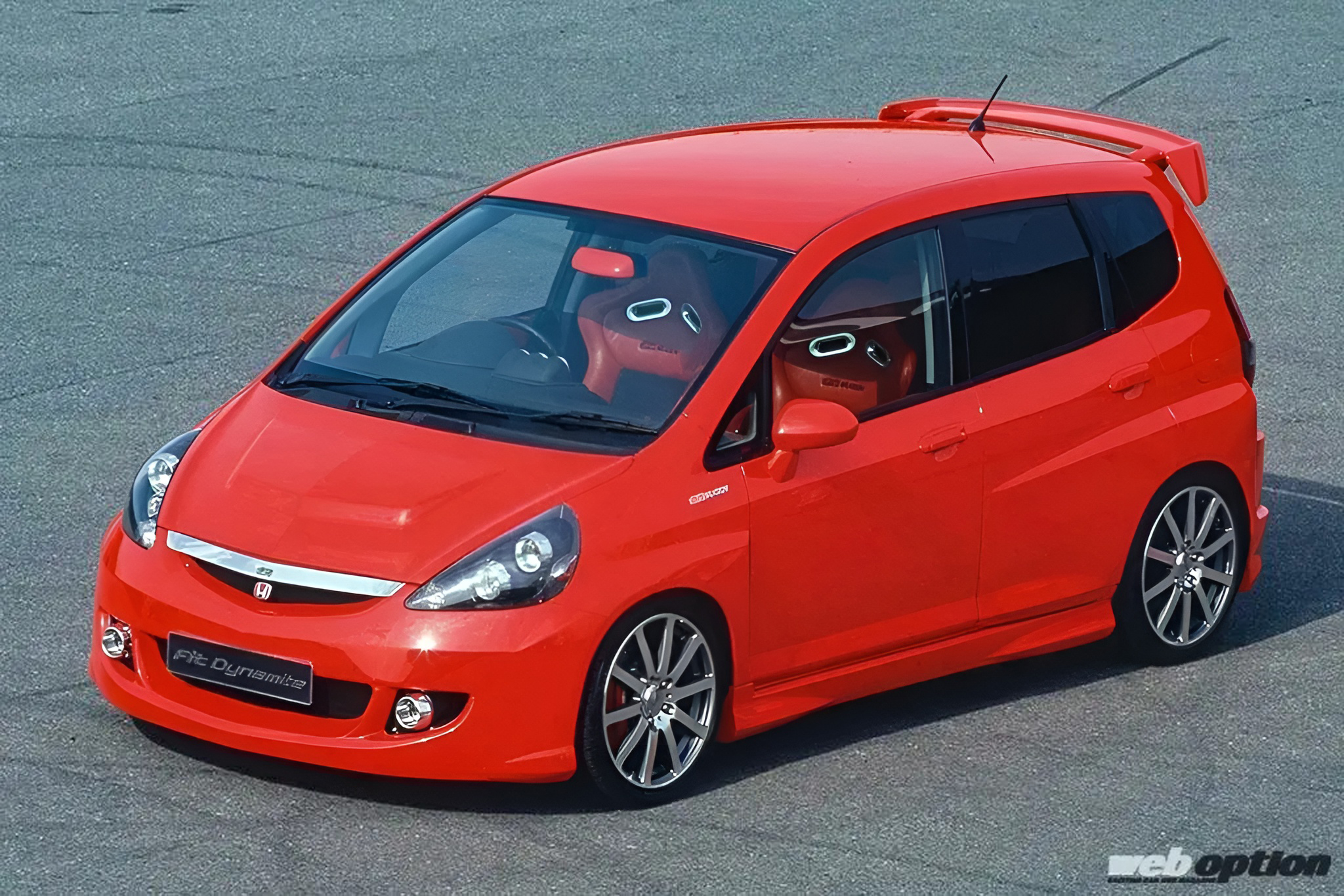 この只者ではないオーラを漂わせる真紅のGD型フィットは、無限が東京オートサロン2004で発表したコンセプトカーだ。その名も“フィットダイナマイト”。ブリスターフェンダーを軸とした攻撃的なエクステリアもさることながら、パワートレインがとにかく凄まじいのだ。