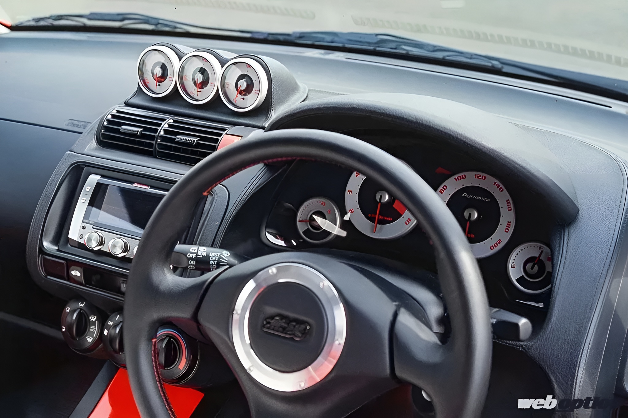 コクピットは、あまりに自然すぎて気づかないがメーターパネルは作り直されている。センターパネル上に装備された、3連メーターとデザインを共通化したフィットダイナマイト専用品だ。