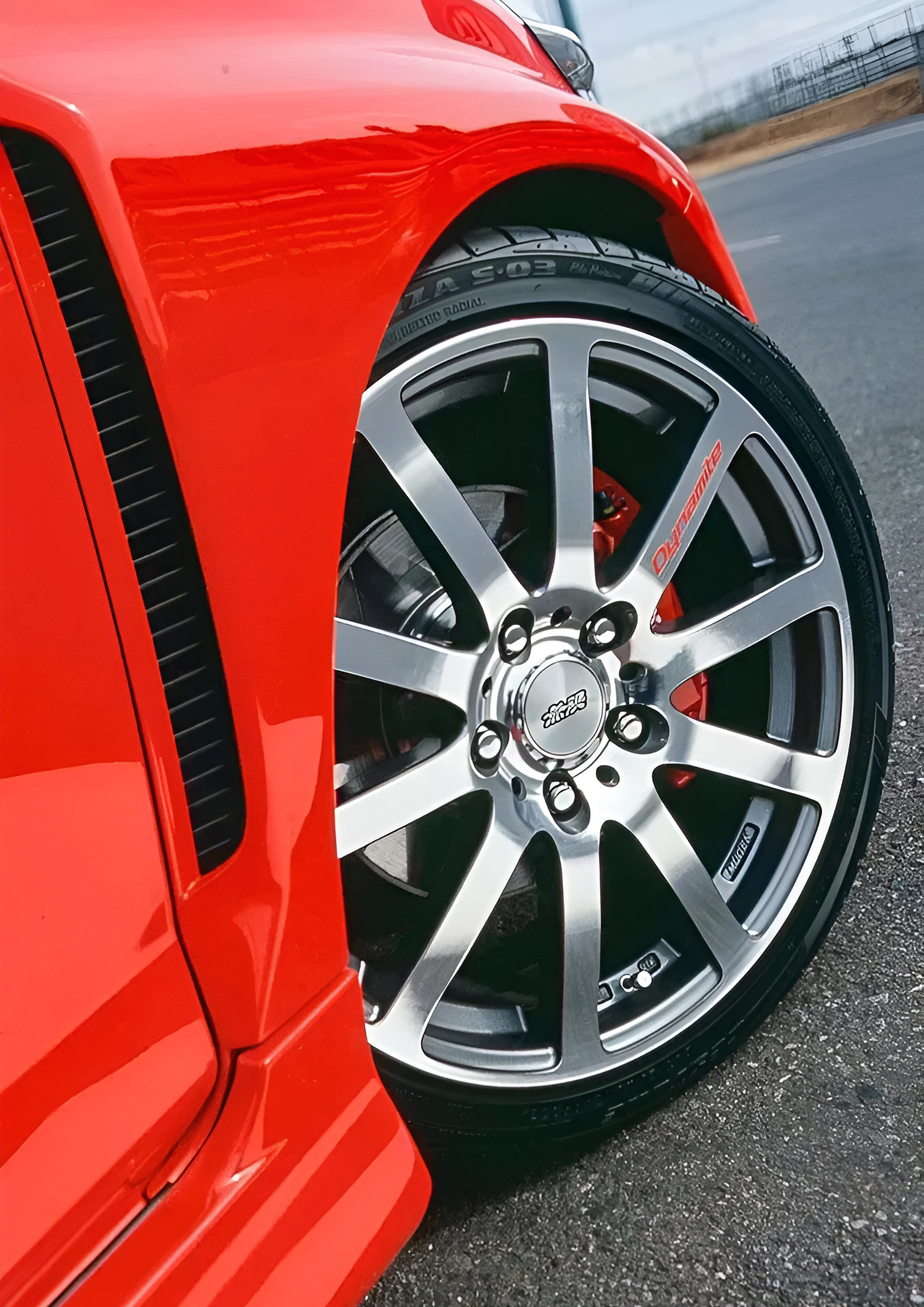 ブレーキもDC5純正のブレンボキャリパー&ローターを移植。サスペンションはフィットダイナマイトのためだけに専用開発したオリジナルの車高調を装備している。フェンダーはブリスター化して全幅をDC5と同じ1725mmまでワイドトレッド化。ドライブシャフトはワンオフが組まれている。