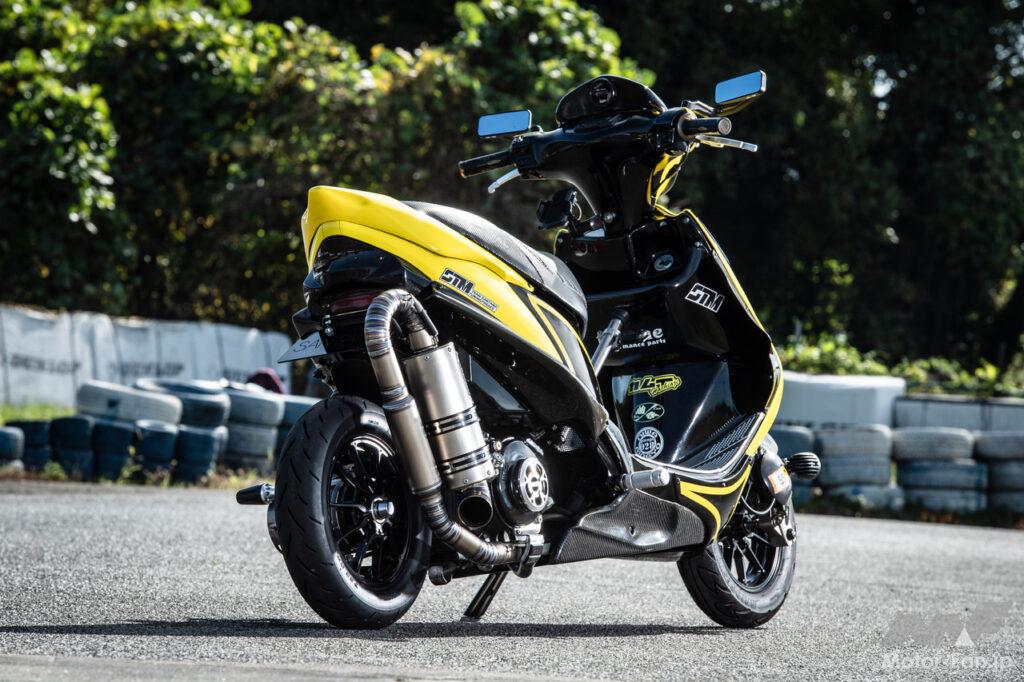 199cc仕様のエンジンに大型マフラーをセットしたアドレスV125G 2026.04.13 08:00 2026.04.13 11:56 更新 この記事の画像をもっと見る(全2枚) TTMRC製のφ63mmピストンで199cc化。そこに合わせるマフラーはSSPファクトリー製のワンオフユーロタイプとなっていて、外観上のインパクトも抜群。前後ホイールはMFZ製の鍛造アルミを投入するなど、ストリート仕様ながら豪華なメニューが奢られている。【スクーターミーティング2024】 ◉OWNER:フジ @TEAM三多摩さん ◉MACHINE:SUZUKI ADDRESS V125G ◉SS1/32mile:4秒230 ◉Class:SC4 INDEXボリューム満点のフロントフェイス ボリューム満点のフロントフェイス 自作というフロントマスクやNSR50用を加工流用したというフロントフェンダーがボリューミーな印象。車体左サイドにはオイルクーラーが設置されており、ベリアルサービス製シートやサブフレームも特徴的だ。 ※この記事は月刊モトチャンプ2025年3月号のものです。 バイクカスタムの関連記事