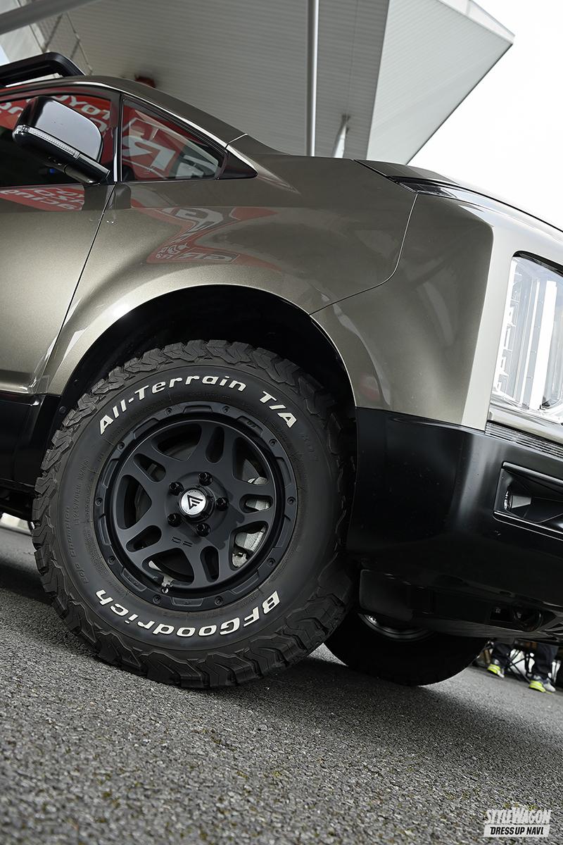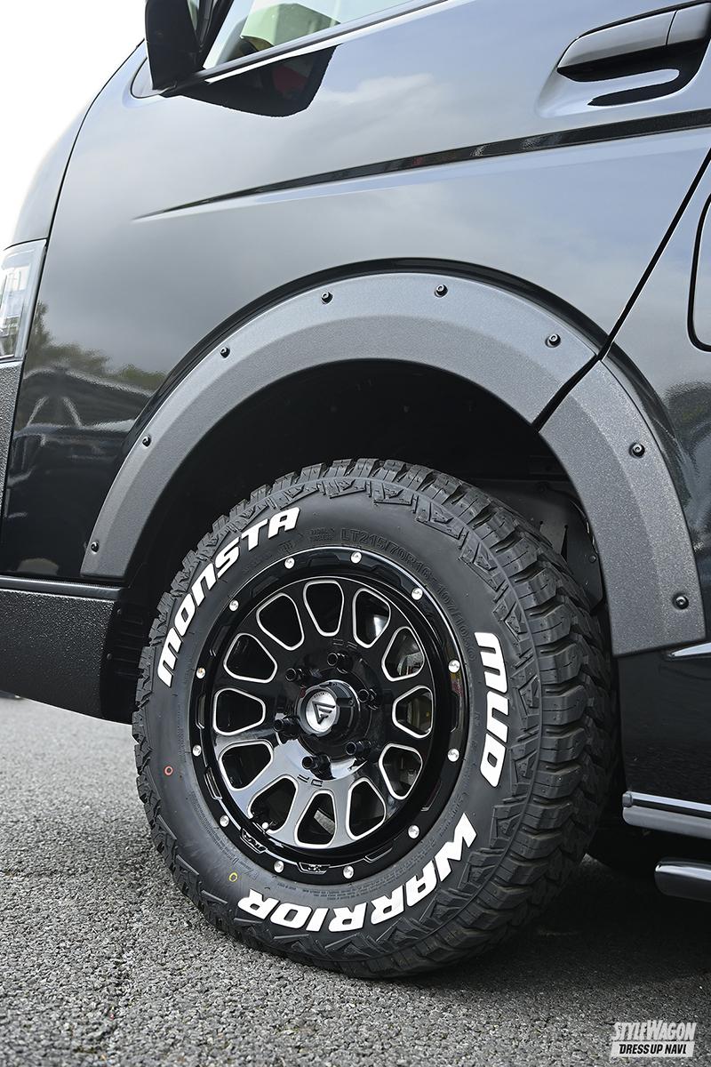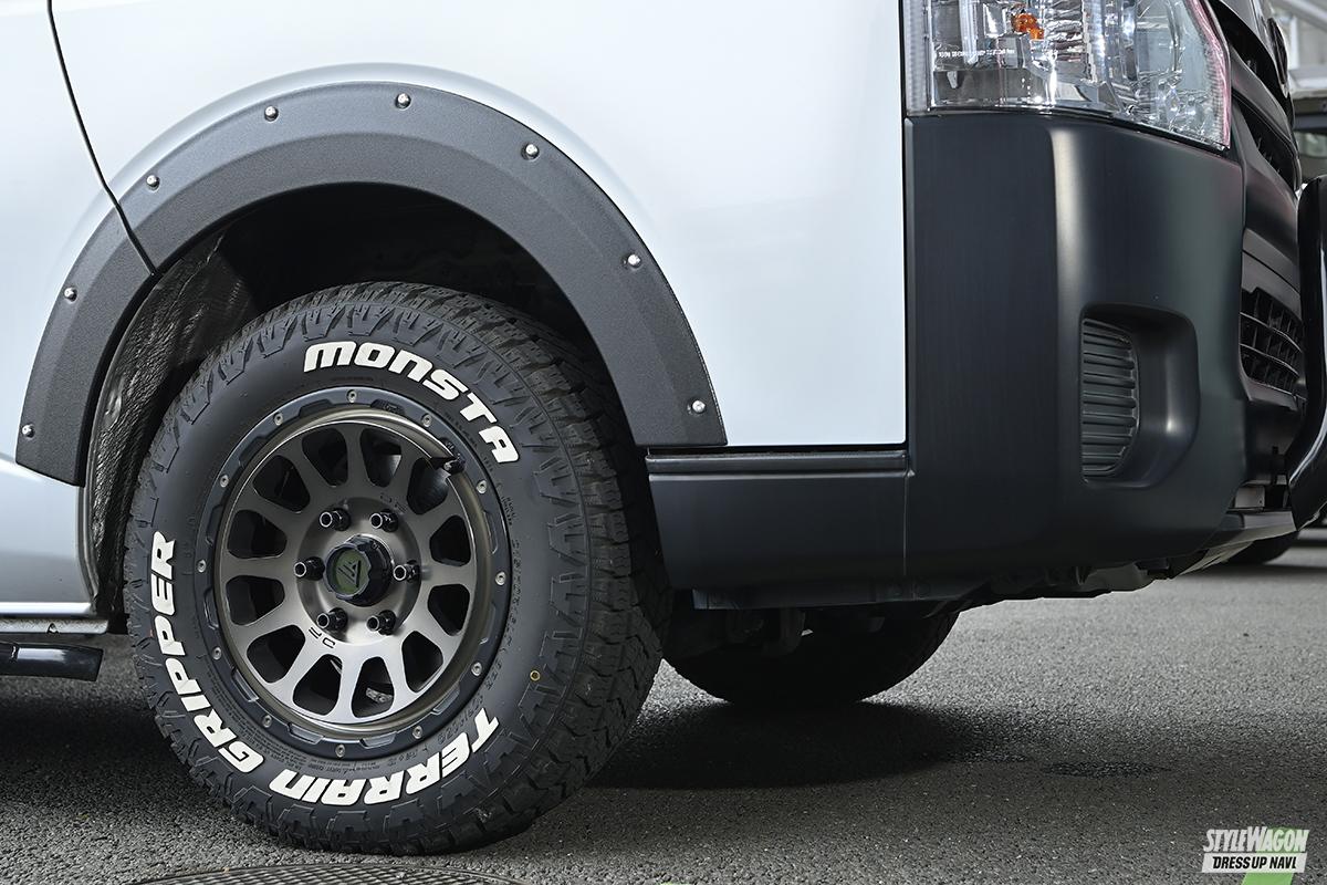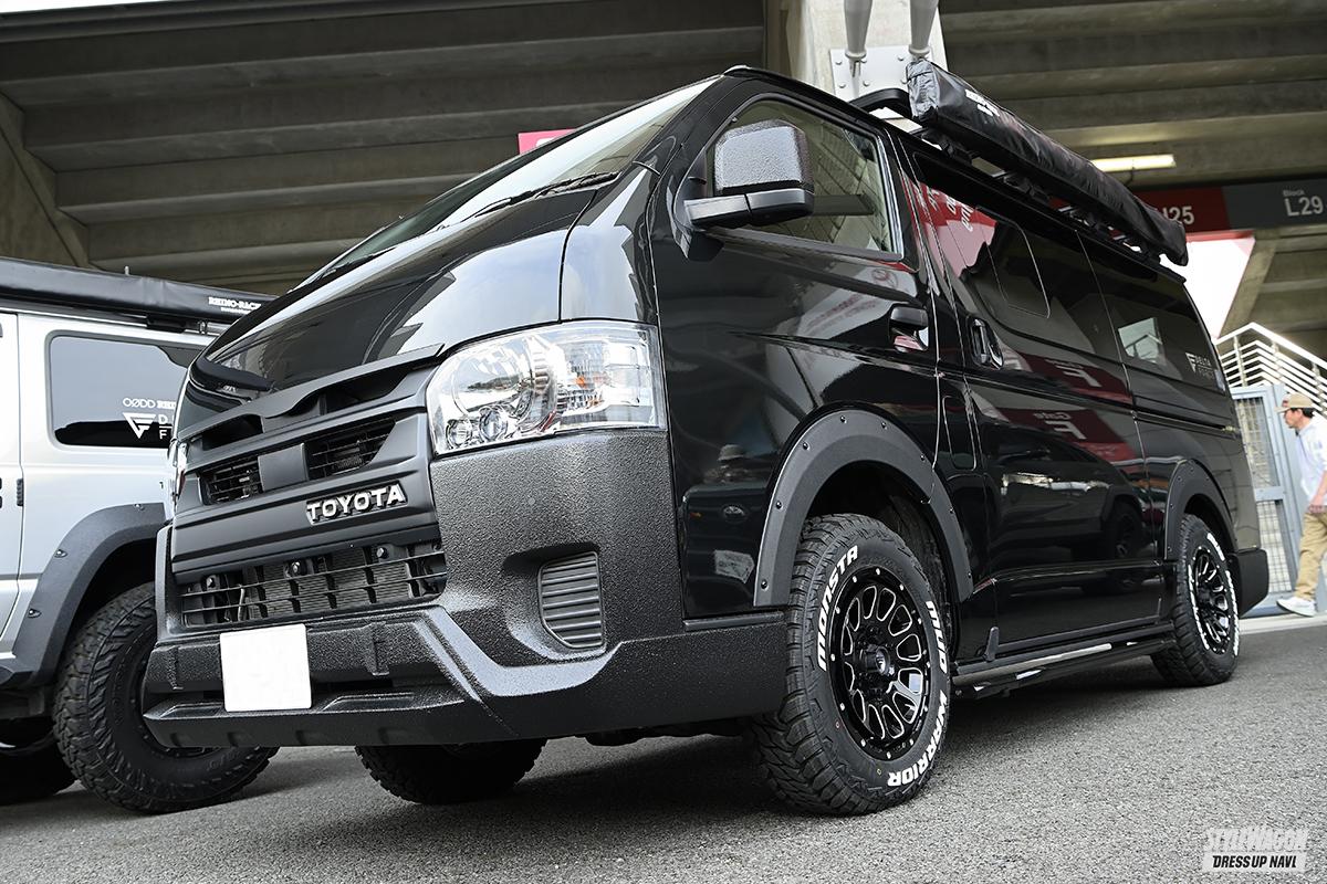 デルタフォースといえば『オーバル』と言っても良いほど大ヒットホイール。国産SUVからデリカD:5、30アルヴェルなどのミニバン、そして輸入車と対応車種も豊富。ここで注目したいのがこのハイエース。設定色の中で一番人気はマットブラックで、ミーティングに参加していたユーザーもマットブラックを履く例が多かったが、同車は敢えてブラックマシニングを選択。オーバル特有のホール形状がハッキリわかる色味は、他車との差別化を図るのにも最適。さらにオーナメント部の色も選べてアレンジ可能。さらにライノラック製品でアウトドア志向に仕上げてあった点もポイントだ。