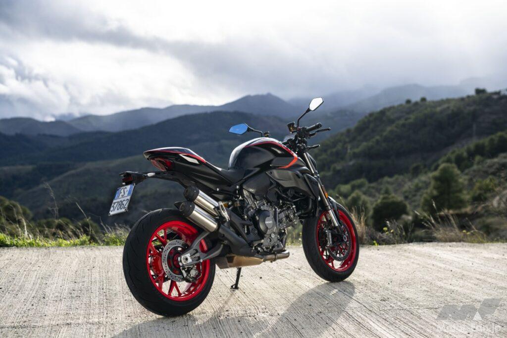 モンスターの大きな魅力である軽快さは、今回も健在だ。アルミモノコックフレームを中心とした車体構成により軽量化が図られ、先代比で約4kgの軽減を実現。これにより、俊敏で直感的なハンドリング性能を獲得している。