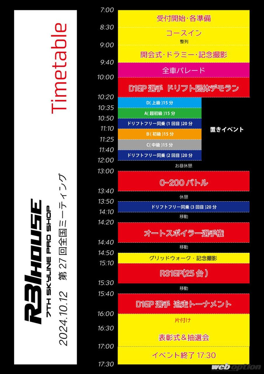 今回で27回目を迎えるR31全国ミーティング。鈴鹿ツインサーキットを舞台に、フリー走行(グリップ)、全車パレードラン、0-200mバトル、オートスポイラー選手権、R31GP(グリップレース)、R31アワード(置きイベント)など、多彩なコンテンツが用意されている。